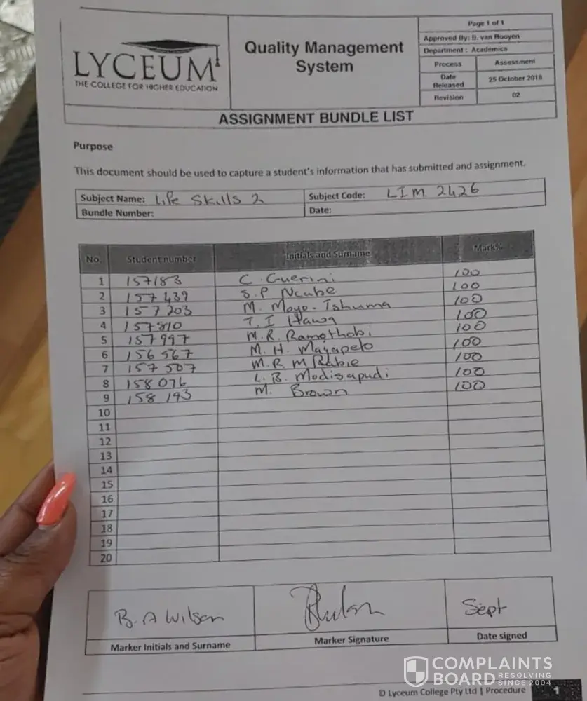 Lyceum Correspondence College I am complaining about my Life Skills 2 2427 mark that is not loaded.