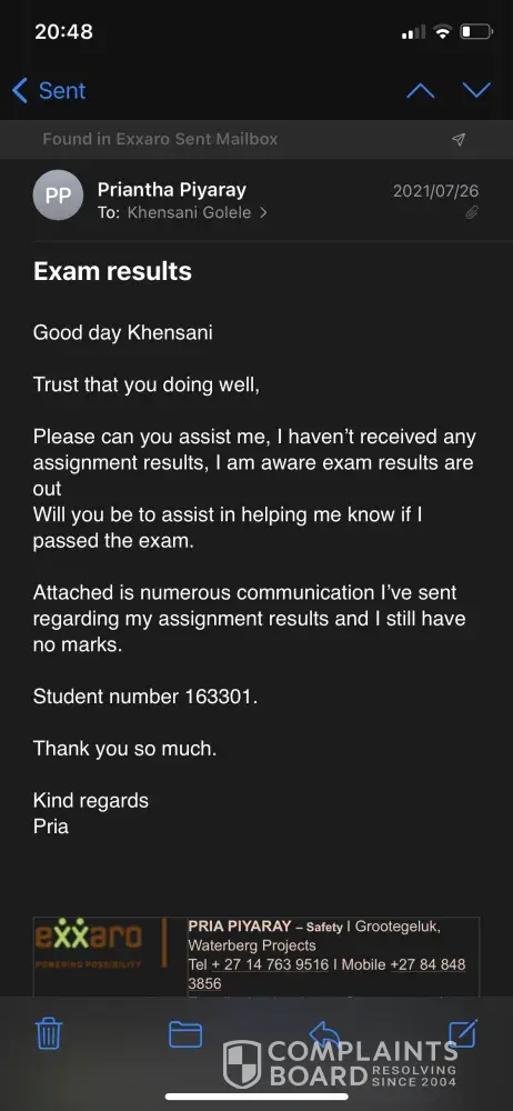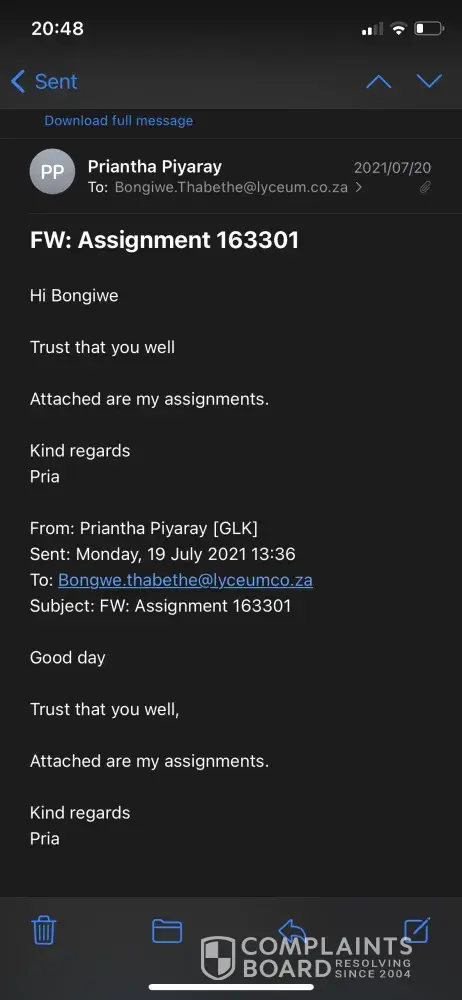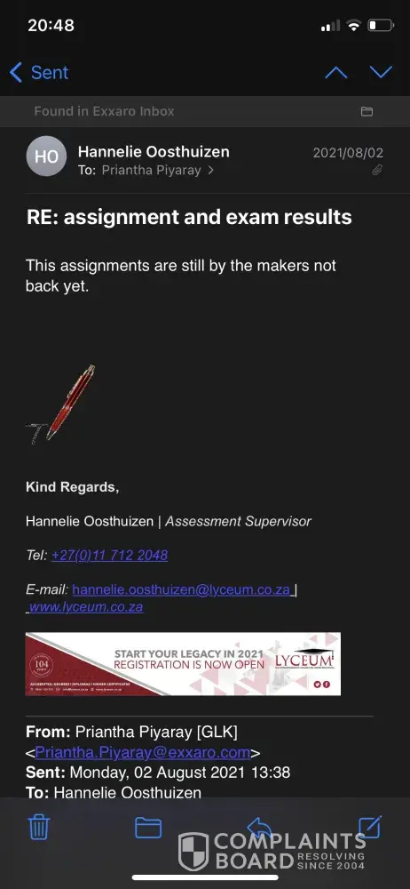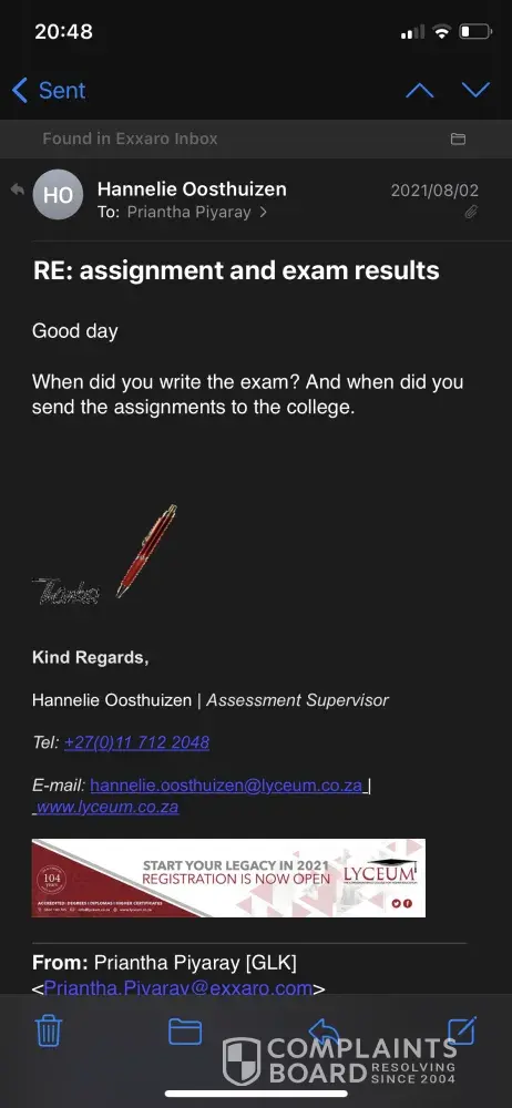 I started the process of applying and registering at the college back in early February this year with a student advisor by the name of Natalia Davids she eventually sent me the forms after about a month and a half after I enquiried about the Grade R course she sent all the forms I filled them and sent back I sent follow up emails followed by phone calls trying to get feedback on my application eventually by end of March after literally hounding them for feedback either she was never at work or she never replied to my emails but my application was finally approved and awaiting payment for the registration fee of R4000 8 paid on the 30th of April and sent proof on Monday the 3rd of May and waited for feedback I left it that week on Friday I sent an email requesting feedback for acknowledgement to advise me if she has received the proof of payment no reply I phoned the college she was not at work but I was advised to wait as the process was delayed due to the number of students applying I should give it a week that was last week Friday while waiting for the week to finish so I can follow up next week I received an email from another student advisor named William he sent me forms of the same process of application that I have done already I replied to his email telling him I've already done this and paid I'm waiting for feedback for the registration he an automatic response came stating he was busy he'll get to me initially I got worried that what is going on now as it was later in the afternoon I waited for the following day I phoned and asked for Natalia my student advisor as usual she was not in I raised my concerns and refused to go without an explanation I was promised that her supervisor will contact me I waited and no call was received I phoned again today the 13th of May 2021 asking for her again I was transferred and the call was ringing and no answer and it was dropped I phoned again really frustrated this time told the person helping me that I'm not taking this I'm tired of this run around she told me to hold she tried her and got back to me telling me she doesn't know where she was not sure if she was on break or not she took my details and promised as soon as she comes back she will call me and still nothing now I'm worried If I was scammed or not I paid so much money and 13 days later no one has any answers for me please help either refund me or get me registered so I can finally study after almost half the year trying to enroll and register. Seriously Lyceum is unprofessional and really frustrating