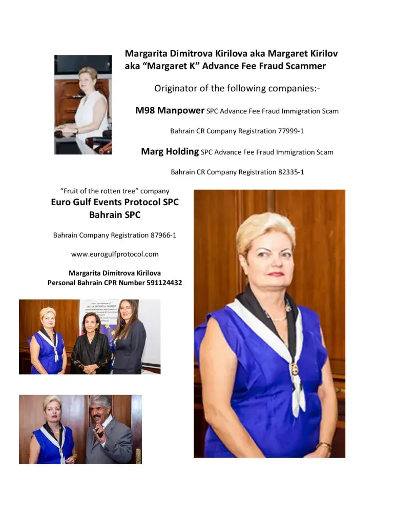 http://eurogulfprotocol.com/ here is her latest scammy website...hope those policemen you are sitting next to realise who you are and lock you up - Margaret Dimitrova Kirilova - you scammer fraud...