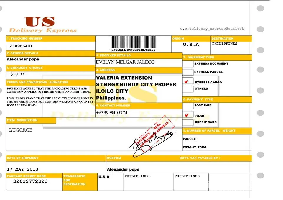 If its too good to be true, chances are it's not true. at minsan nakaka buti din ang walang pera na agad agad ay madudukot. thank you very much sa mga post ninyo. muntik na akong nabiktima. Meron pang pinadala na image ng shipment airway bill using FREIGHT TENDER company send sa Pakistan at nakalagay ang name ko duon. magaling mag pa atat send pa ng picture ng mga item na pinadala daw sakin. dumating na daw sa Davao Airport at me nag text na AILEEN P. ZABALLA magbayad daw ako ng 9k. Since, wala pa ako pera at parang hinde normal na ang recipient ang magbabayad to get the package na dpat ay door to door delivery. Nag google nga ako at eto na ang ang nabasa ko. Salamat po talaga ng marami!