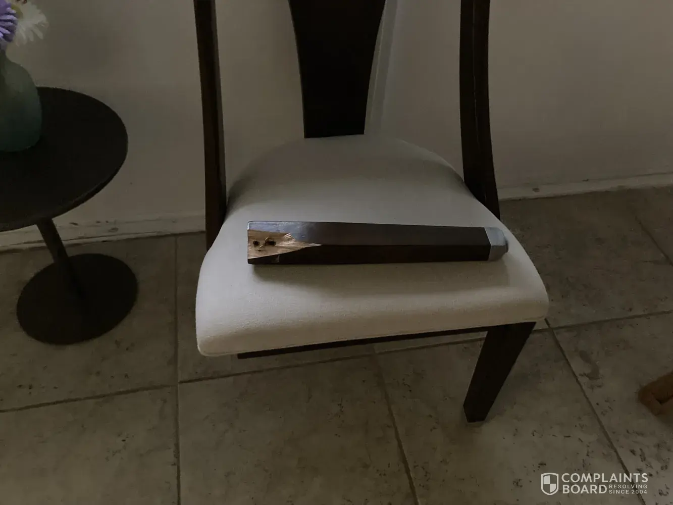 I purchased a dining room set in February of 2019. In October 2020, I was sitting with friends on one of my dining room chairs and the rear left leg of my chair cracked and came off completely from the chair body. I took the broken leg to The Gardens Macy's store where it was purchased and was told the warranty has expired and there was nothing they could do. I found a furniture repair man and had the leg installed back on the chair at a cost of $150.00. Unfortunately, however, because of the way the leg broke off, the chair leg is slightly shorter and tilts when sat on.