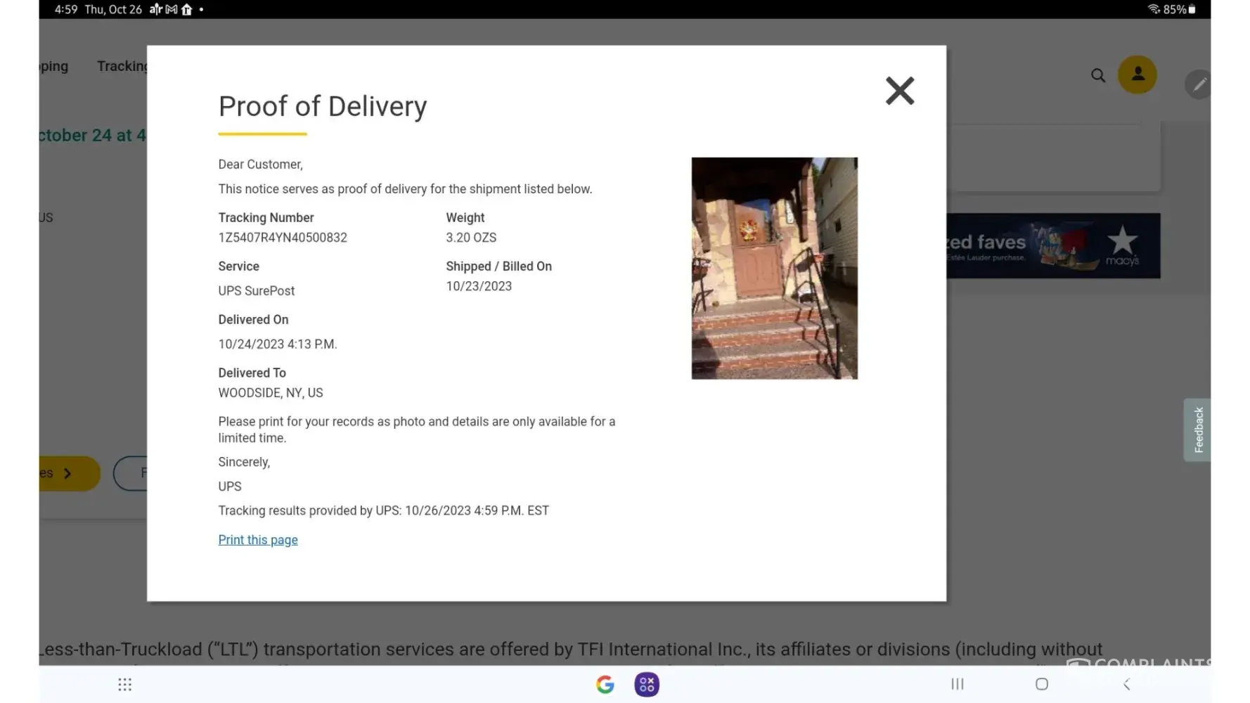 I made a purchased online 10/22/2023 with order# [protected] it's a Crucifix Pendant. I track the package and it was delivered; I check UPS tracking # 1Z5407R4YN40500832 based on the photo as proof of delivery that is not my address. I filed a complaint both Macys and UPS for this loss claimed. I attached my home address screenshot and the proof of photo to where the item was delivered.