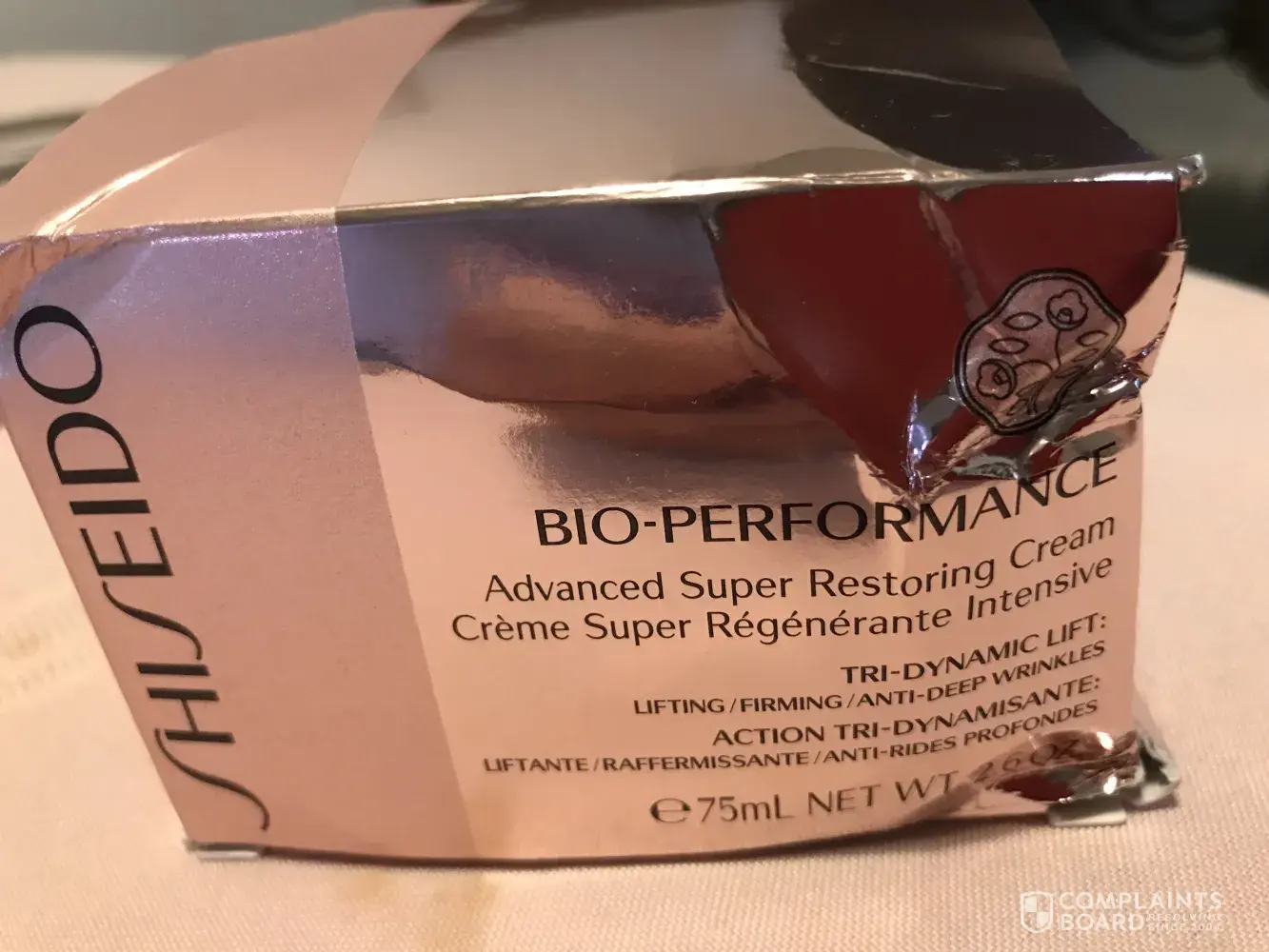 I am a Macy's platinum number. I have ordered Shiseido bio-performance advanced super restoring cream, 2.5 oz. and 4 pc Clinique Travel set. When I got this product, the box all break, looks old stuff. I bought it as gift for my friend, now I am unable to do because too much damaged. I am very upset with this situation. Please help me. Please see attached files.