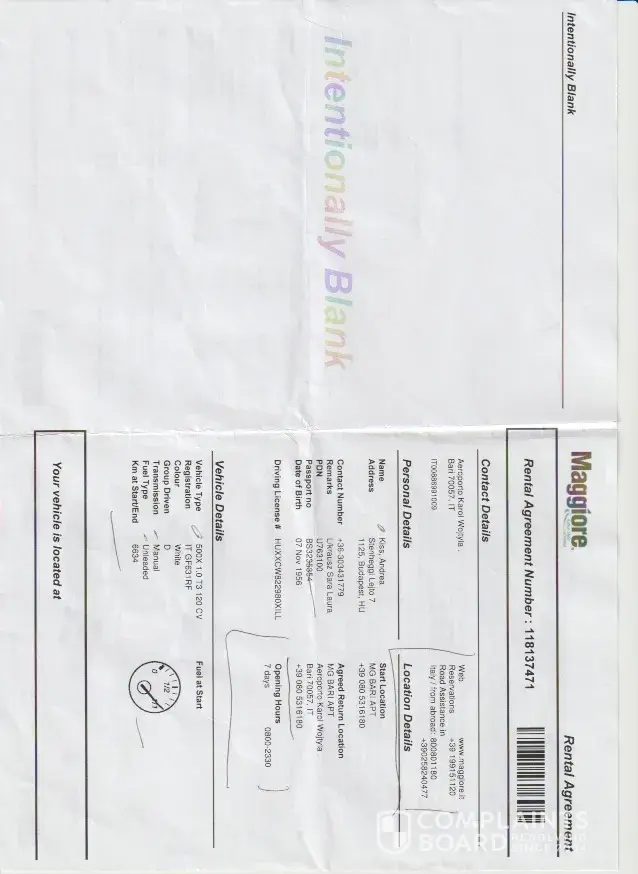 I rented a care with maggiore through online broker rentalcars.com (booking reference rentalcars [protected]) for the peirod 5/7/2018 to 16/7/2018 at the Florence airport desk.