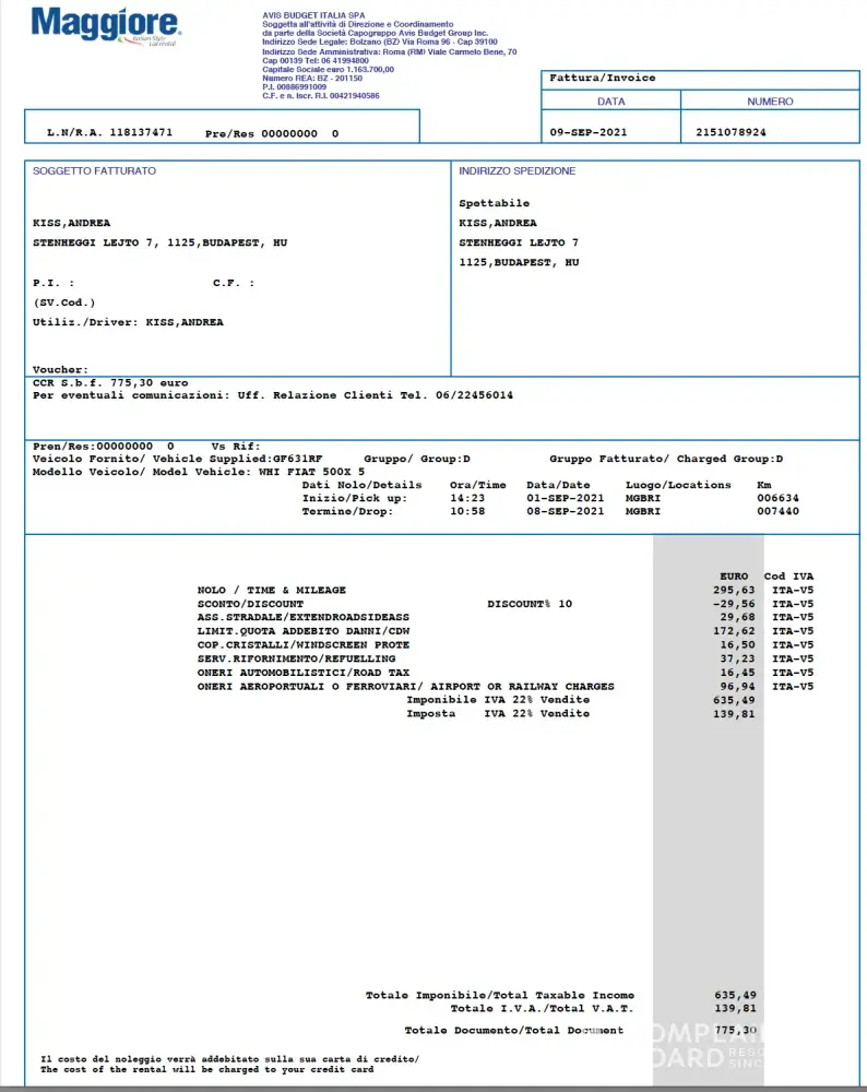 here is what happened : I have rented a Fiat 500X from Maggiore on September 28th of 2019 at 10:27 and returned it on September 29th of 2019 at 10:31 Â