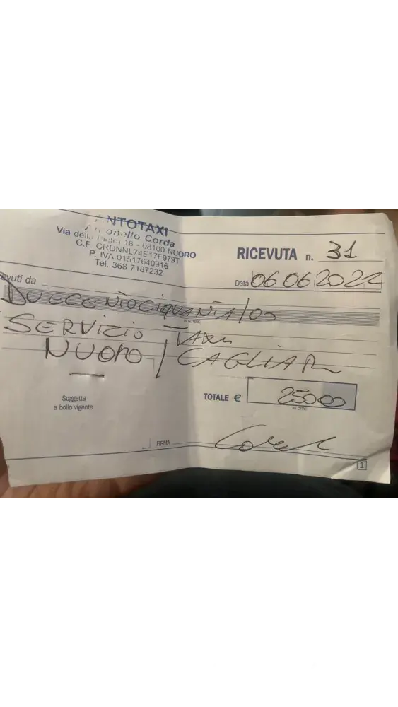 I tried discussing the situation with an exceptionally impenitent member of staff but he seemed to have no clue that a car was supposed to be waiting for me. He did, however, assure me that if I got a taxi from Nuoro to Cagliari and kept the receipt, it would be refunded at Maggiore Cagliari Downtown. He then ordered us a €250 taxi (receipt attached).