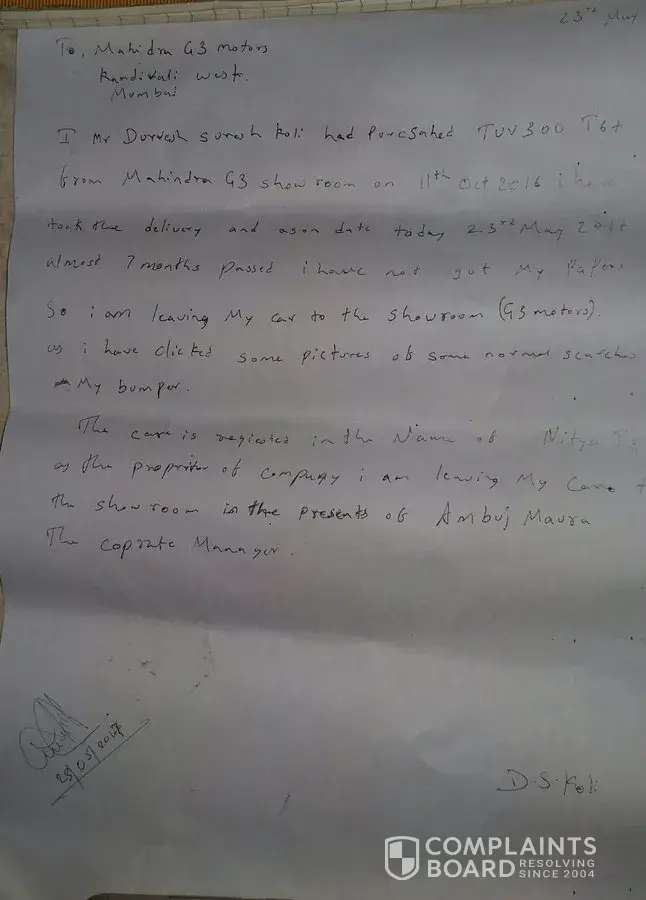 I mr durvesh koli the proprietor of nitya tours&travels had purchased the car tuv300 t6+ on t permit from g3 motors kandivali west mumbai. The delivery of the vehicle was given on 11th october 2016 and yet i have not got the or papers from showroom and i am facing a huge loss because i don't have appropriate papers along with me. So on 23 may 2017 i have left my car to the same showroom has the coprate corner manager mr ambuj maura told me it will take more 2 days n today is the 4th day so this mail is to inform you that i don't need my car because i have faced a lots of loss in it so please do the needful
