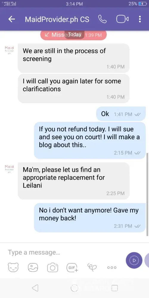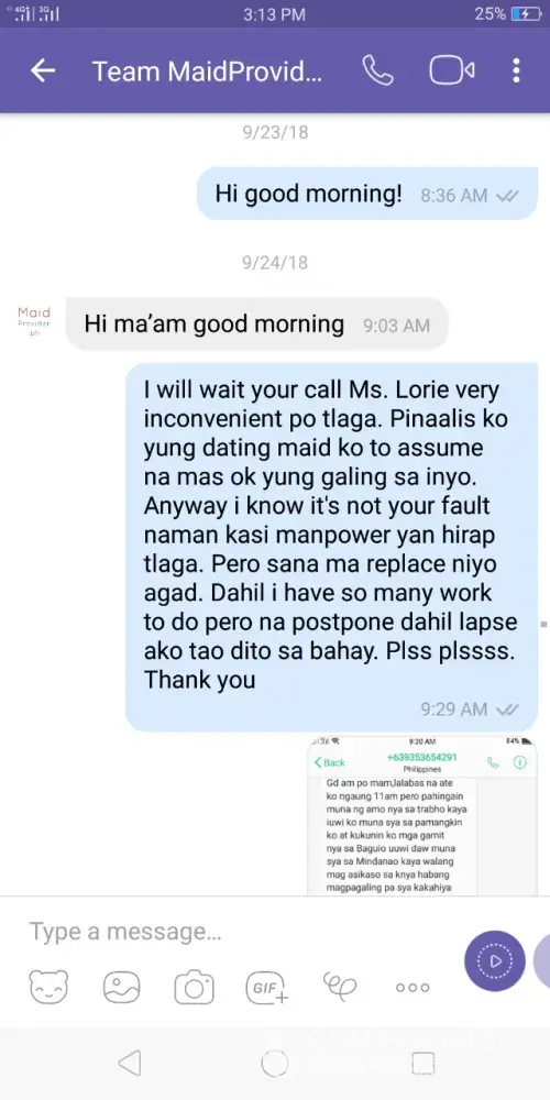 We hired a live-in maid in the Philippines from Maidprovider. ph on 3/14/22. We payed Maidprovider. ph 16,000.00 pesos for this maid. She was supposed to take care of my mom who was just discharged from the hospital due to kidney issues. However, since day one the maid has been threatening to leave my mom. After 4 days of service, the maid's boyfriend continues to harrass her to leave my mom and accused us of not giving her a day well in fact it was just her 4th day working for us. on 3/17/22 she threatened to leave my mom again after her boyfriend called her to come home or else he will let women in her house. We talked her into staying and just finish her 6 months contract then she can leave or give us a 2 weeks notice so we can find a replacement if possible. On 3/28/22 the maid told my mom she is leaving because she wants to work in a factory instead. We asked her if she wants to leave, she will forfeit her contract. She decided she will stay. However, on 3/28/22, the maid left my mom in the middle of the night after talking to her boyfriend. My mom is bedridden, unable to care for herself. She asked the maid if she can stay until morning but the maid packed her suitcase and left my mom all alone in the house in the middle of the night. This is a case of abandonment, neglect and unprofessionalism! She has placed my mom's live in danger and the maid has been very unstable mentally and psychologically changing her plans on a daily basis whether to stay or leave. Place yourself on my shoes what if it is your mom she abandoned in the middle of the night. I am so furious about this and everytime I think about it, I felt that they have done us injustice. I asked for a refund but the person in charge of maidprovider. ph has been ignoring me. I wrote her a letter asking for a refund and she has not answered yet. I would appreciate any assistance you could provide us. Thank you