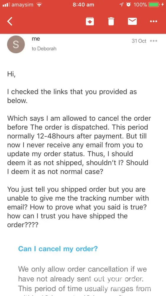 They promise to customer 100%refund for in satisfaction, but when I sent email to them on 31-oct to cancel order and refund the money, They refused because my order shipped. Then No reply anymore from them when I ask for tracking number .