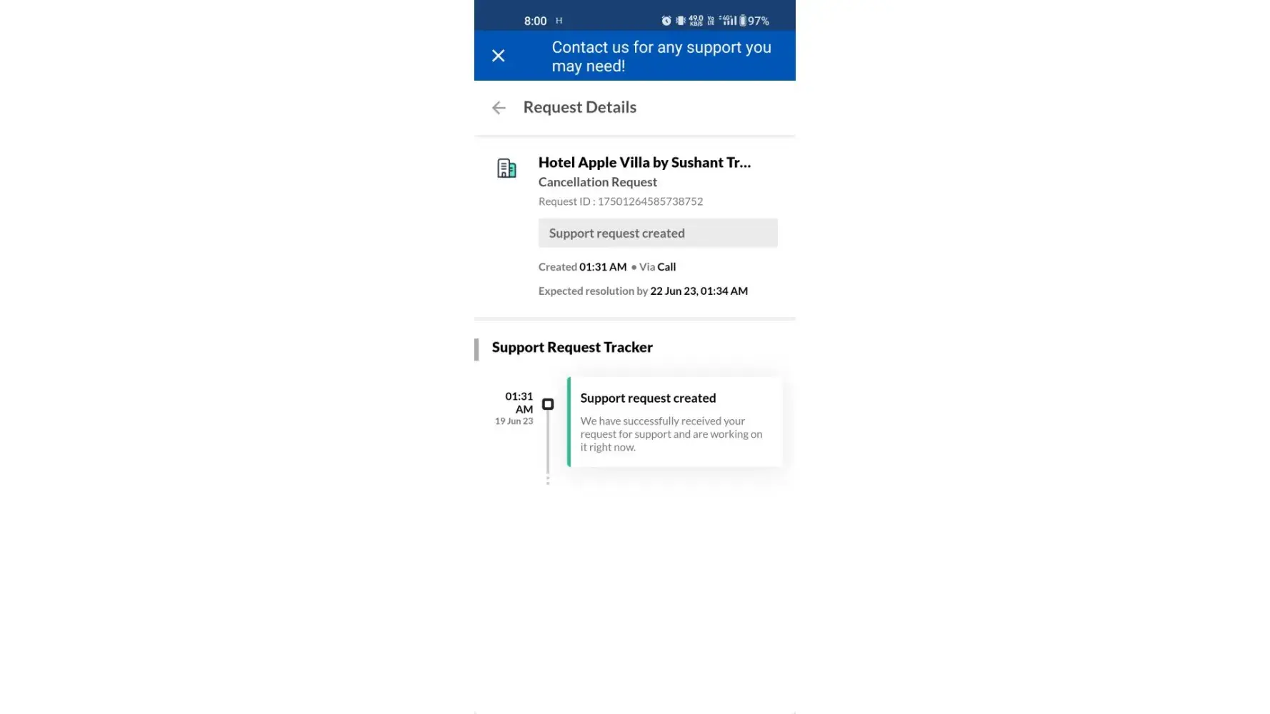 After above 30 min conversation results zero. Mmt agent raised the ticket for hotel for cancellation and request to receptionist but he said I don't have access speak to the Vijay on WhatsApp call. Receptionist also try to reached but not connected and I am also tried.