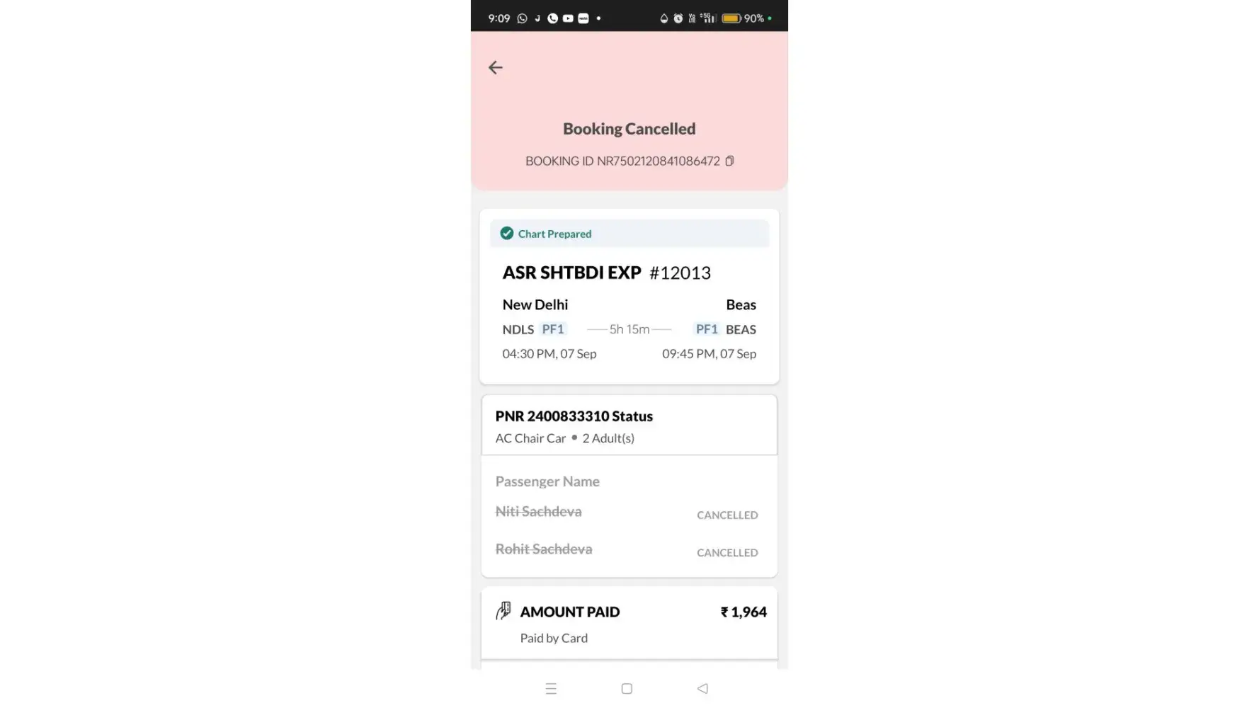 PNR no [protected]. This ticket was cancelled on 5/9/23 (Booking id - NR [protected])