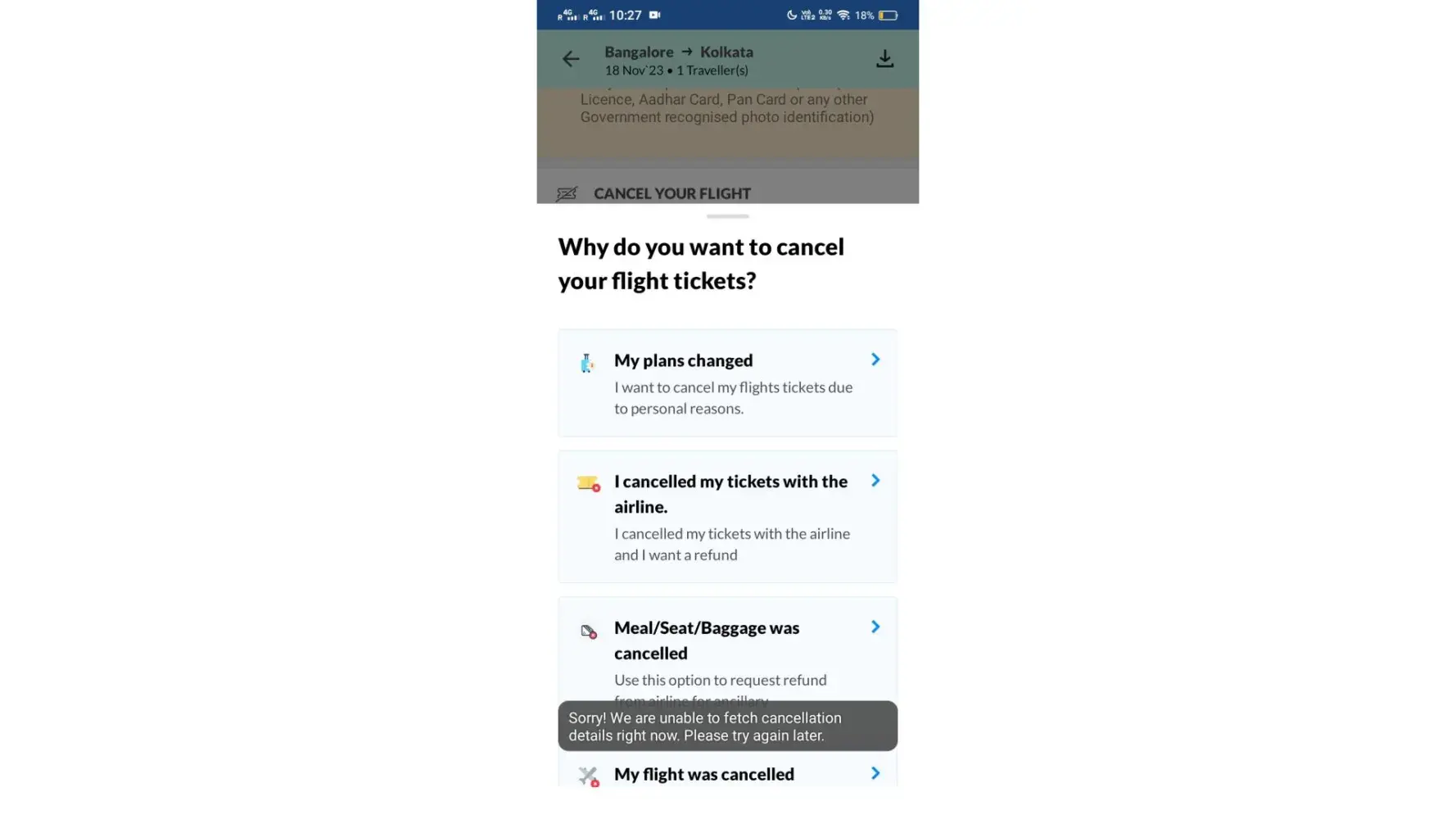 I booked an indigo flight from Bangalore to Kolkata for 18 Nov 23 with the booking id NF733F77IO0POQQH8024. I'm unable to cancel the flight. It is showing they are unable to fetch cancellation details.. I tried calling them on customer care and in the options to select I couldn't find my booking and when I type last digit of my booking ID as they asked they are saying no booking is found with this id. If I was able to cancel it within 24 hours I would have lost only nominal penalty but because of their technical issue I am unable to cancel it with in the time frame.
