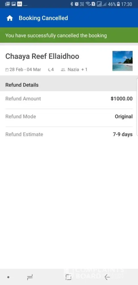 I booked a guest house named 'Leandro Vaz' at Goa on 10th November via MakeMyTrip. I received a call from MMT on 16th November saying that 'They are cancelling this particular booking (ID: MHS209044) due to some issues at their side. And they will refund the amount INR 6300 which will be credited in next 7 working days. Also they asked me to book another hotel/guest house upto Rs. 9000. And asked me to send the invoice copy along with bank account details. And that extra cost Rs. 3000 will be credited to the bank details provided by me.' So my total refund amount is Rs.9300.