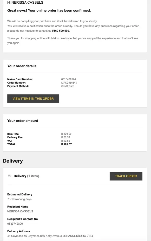 I ordered a washing machine and two chairs on 23 March, hoping that it will be delivered before the lockdown of 27 March. It was not and I am still trying to get any response from Makro. Received an order number (MAK2443675) same day and then a message to say that my order was packed on 26 March.