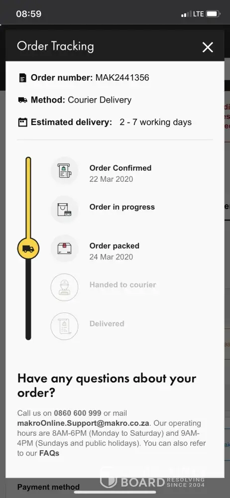Order MAK2442620 ordered online, 23 March2020, tracking noted goods packed. 27 March Lockdown level 5.