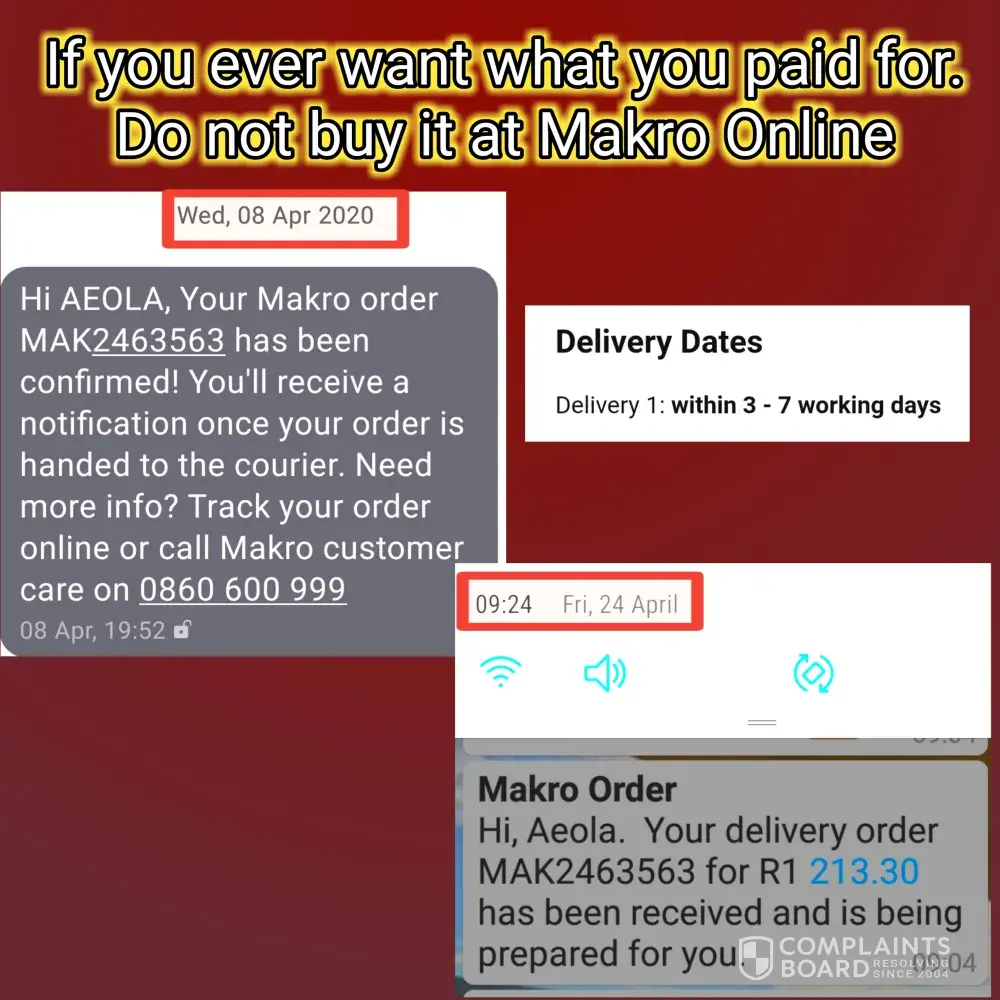After I placed my order and seeing that there was no progress I decided to dig deeper and find out what's really going on in this company. After further research on Hellopeter and this site I have come to realize that this company is incompetent and completely failing their customers in so many ways that this needs to be escalated to a point where Makro either shuts down its non performing online department.