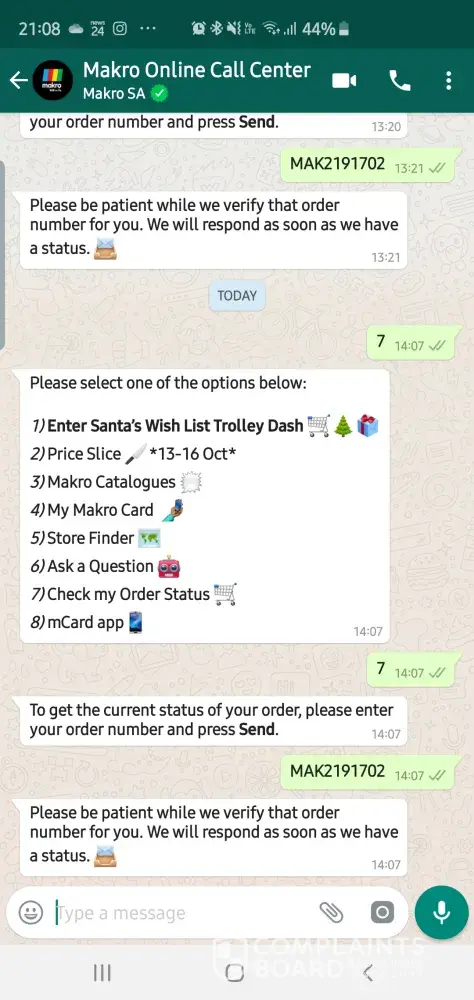 I have not received any update or communication regarding delivery of my online order placed on 7 Oct 2019. Order no MAK2191702. I used the WhatsApp platform to follow up yesterday and still waiting. I followed once again earlier today and then called the call centre. I was promised that someone would get back to me with an update but once again, still waiting. This is ridiculous to say the least for a company like Makro. I am really disappointed.