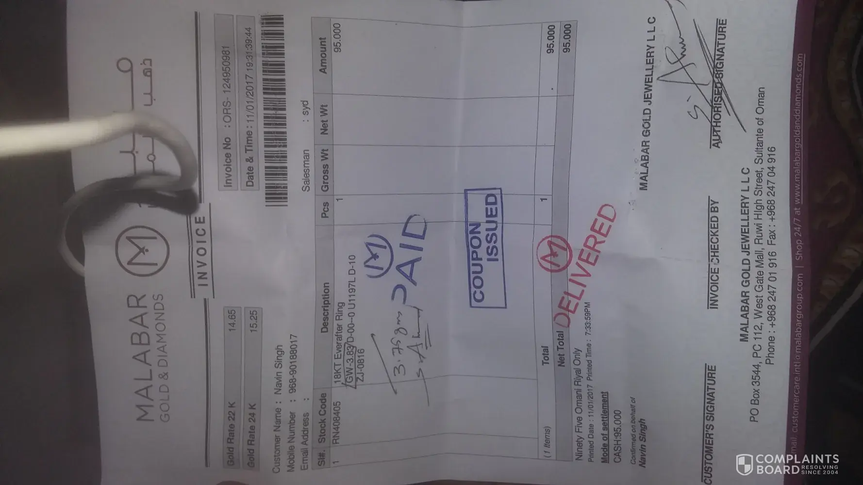 invoice no-[protected], date- 11/01/2016, malabar gold jewellery llc, po box 3544, pc 112, west gate mall, high ruwi street, oman, phn +[protected].