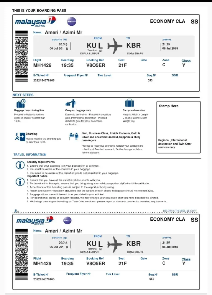 Saya menempah tiket pergi balik kb-kl (10.00 pg-11.00 pg), kl-kb(20.35-21.35) pada 6 Julai 2018. MH telah tukar masa penerbangan saya kepada pukul 16.30 ptg pada 6 julai 2018. Urusan mesyuarat saya pada masa itu belum selesai. MH telah tukar penerbangan kepada pukul 8.25 pagi 7 julai 2018, dan kemudian menukar pula kepada 9.25 pagi pada 7 julai 2018. Tarikh penerbangan saya dari pukul 20.35 mlm telah di tukar ke 9.25 pagi 7 julai 2018. Perubahan ini menyebabkan saya perlu bermalam di KL satu malam.