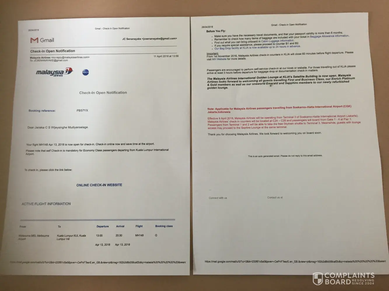This caused a lot of completely unnecessary upset and stress. I have contacted Malaysian airlines through Facebook and emailed their customer services and been given the reference GTS02327-04/2018. Ideally the only way they could offer compensation is an upgrade on our return flight of 19/04. Tomorrow. However, the call centre say they do not handle complaints of this kind and I need to await contact from the head office. They have no number I can use.