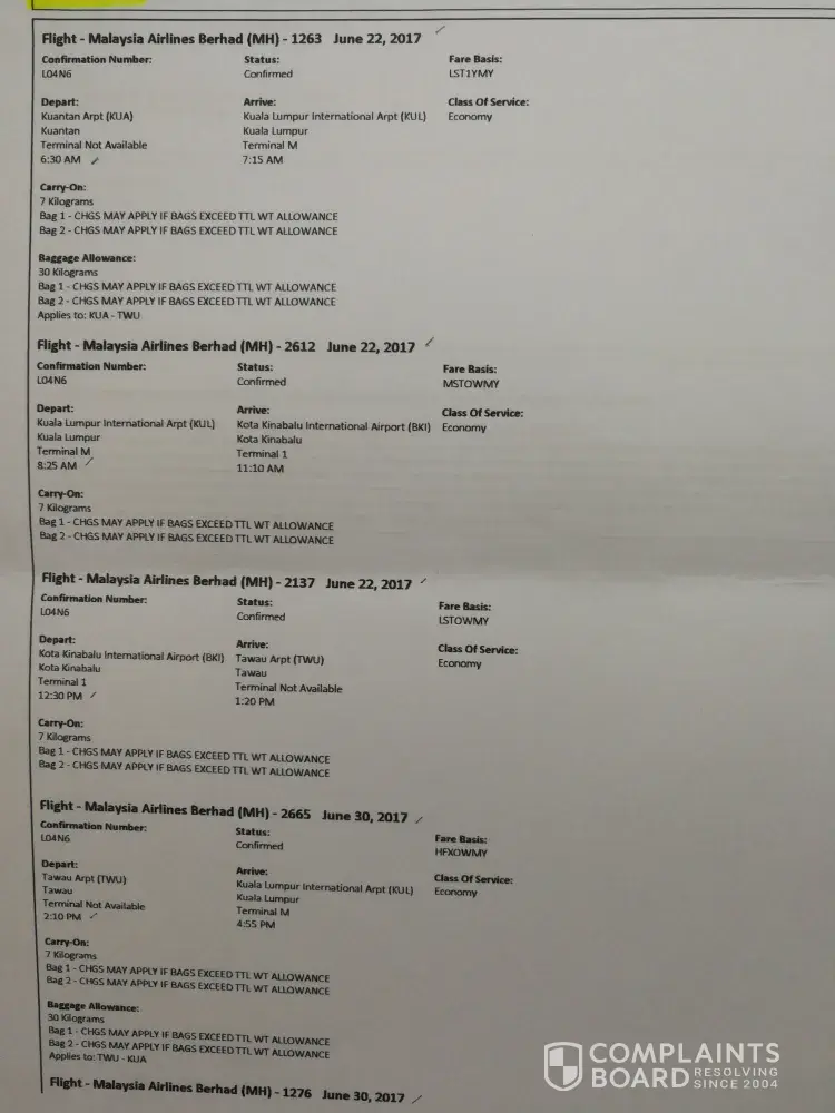 On 3/4/2017, I bought flight ticket for me and six other family members through Travel Agent for sector: KUA-KL @ 6.30am, 22/6/2017 and connecting flights KUL-BKI @ 8.25am, 22/6/2017 & BKI-TWU @ 12.30pm, 22/6/2017.