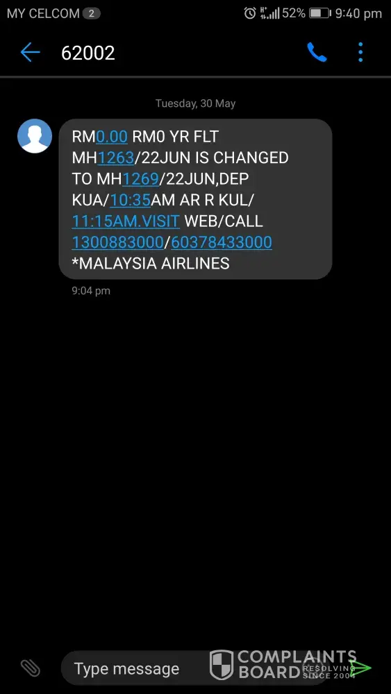 On 30/5/2017, I received notification through SMS that our flight KUA-KL MH1263 is changed to MH1281, ETD 10.35am, 22/6/2017.