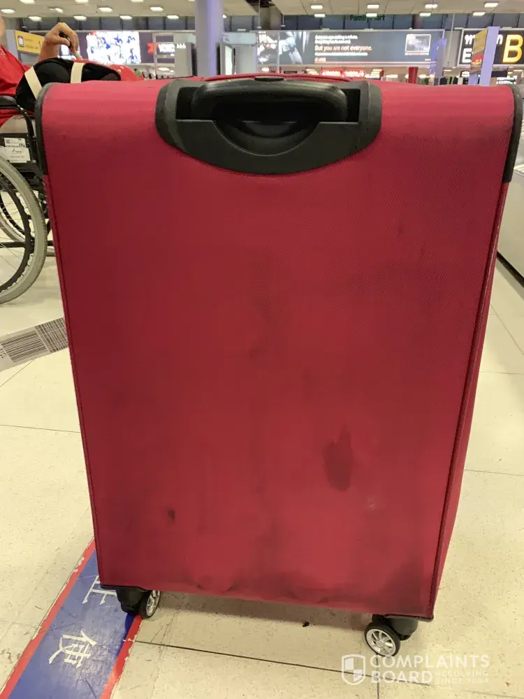 2) On Aug 5, 2019, when I received my luggage at the baggage claim in Bangkok, I found my baggage completely discolored from it's original color. It is extremely dirty. Please see photos attached.