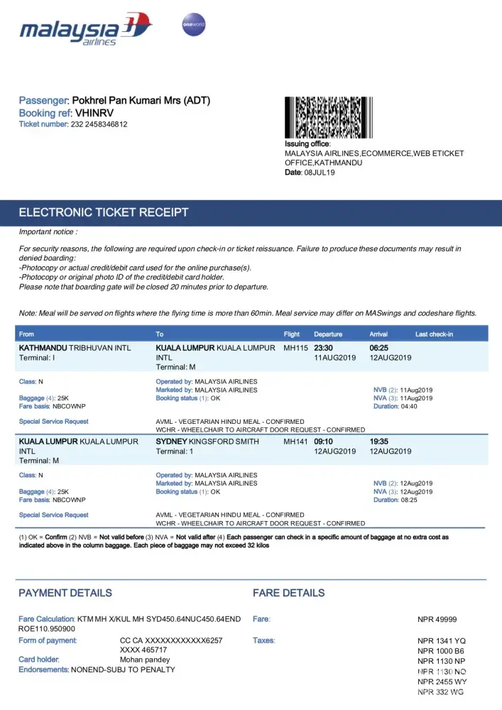 With booking reference VHINRV, my mother in-law Mrs Pan Kumari Pokhrel did arrive on 12/08/2019.