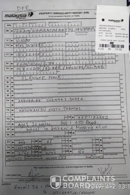 On 01july i called many times and finally at 1530LT a driver from MH reported to our hotel with our bag!