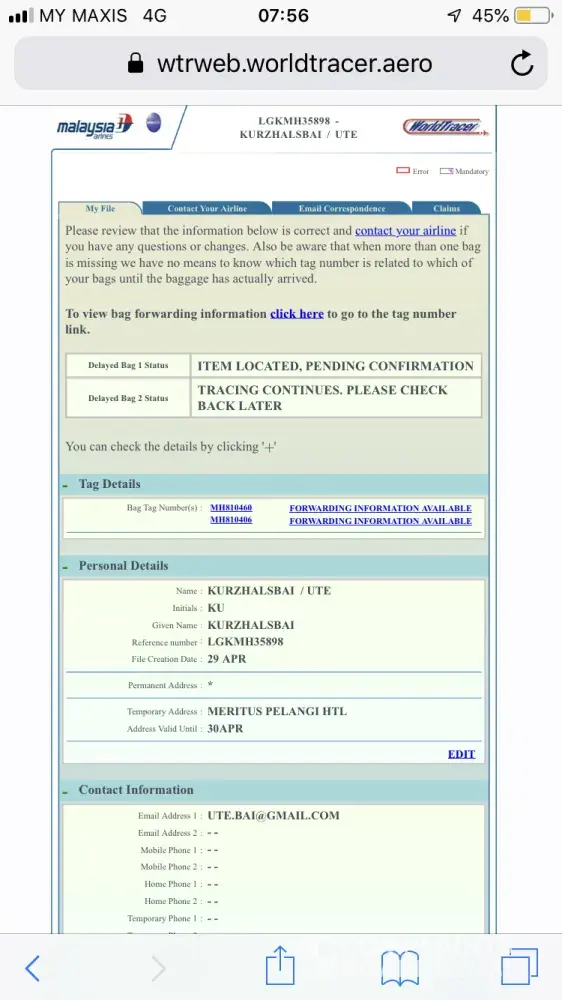 They gave me a number to call and follow up. 30june being a Sunday, no one answered my calls. We were on pins as we were leaving Bangalore on 2nd july night to return home to Kuwait. So I contacted the manager of the Villa where we stayed and he very kindly informed MH staff in DPS to forward the bag to BLR to our hotel address.