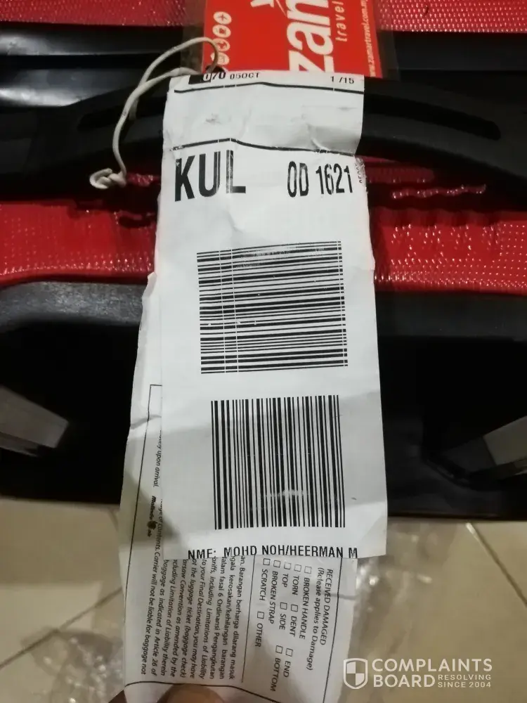 When I received my luggage I saw that the sticker attached at the time of check-in at Mumbai Airport was not present and the zipper of the bag was slighlty open. Upon opening I found that the whole bag was filled with water and all the contents of it were drenched with water. I even showed it to the Malindo executive present near the baggage belt, who asked me to fill a complaint form (attaching an image of the same.
