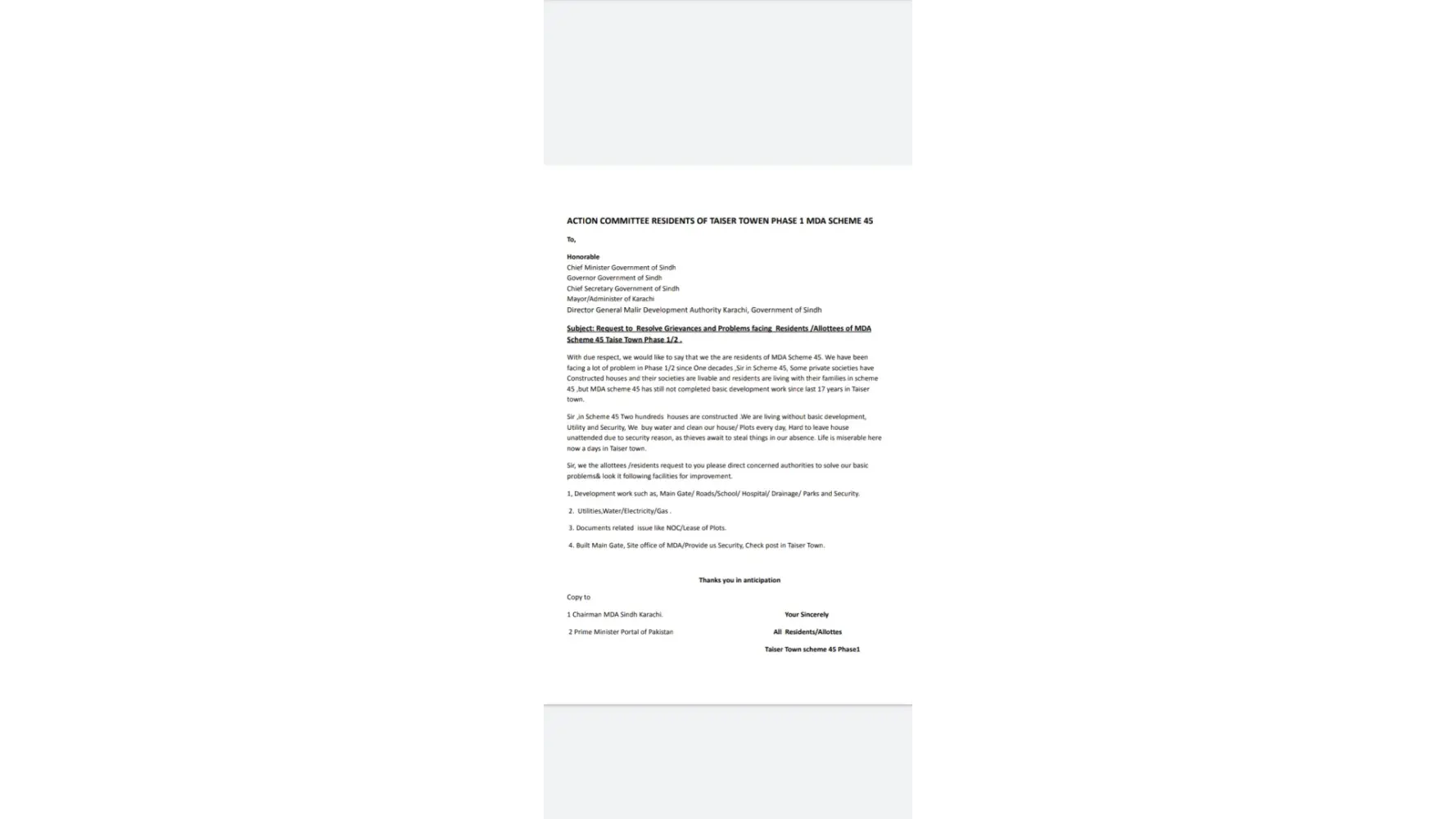 With due respect, we would like to say that we the are residents of MDA Scheme 45. We have been facing a lot of problem in Phase 1/2 since One decades ,Sir in Scheme 45, Some private societies have Constructed houses and their societies are livable and residents are living with their families in scheme 45 ,but MDA scheme 45 has still not completed basic development work since last 17 years in Taiser town. Sir ,in Scheme 45 Two hundreds houses are constructed .We are living without basic development, Utility and Security, We buy water and clean our house/ Plots every day, Hard to leave house unattended due to security reason, as thieves await to steal things in our absence. Life is miserable here now a days in Taiser town. Sir, we the allottees /residents request to you please direct concerned authorities to solve our basic problems& look it following facilities for improvement. 1, Development work such as, Main Gate/ Roads/School/ Hospital/ Drainage/ Parks and Security. 2. Utilities,Water/Electricity/Gas . 3. Documents related issue like NOC/Lease of Plots. 4. Built Main Gate, Site office of MDA/Provide us Security, Check post in Taiser Town