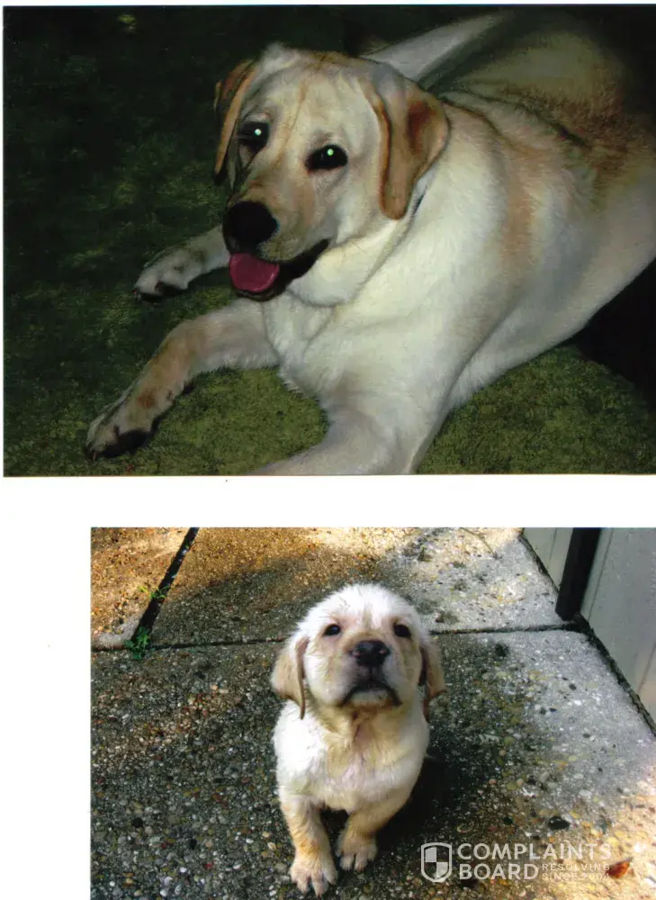 I paid $800 for my puppy and I felt very happy until we got him home and looked him over a little closer. He is a yellow lab with black pigment (nose, eye rims and paw pads). He is adorable and perfect in every way, but he has a black spot on the back of his right hind leg. At first I thought maybe it was a black dot from a black permanent marker to perhaps identify him as "sold" when he was with his littermates. I contacted the breeder, Laurell Hand, a few days later and she said that mismarkings like this can happen from time to time. I've never seen a yellow lab with a black spot before. She apologized for not noticing the spot and not bringing it to our attention. She said that we can bring the puppy back and exchange him for another pupppy from an upcoming litter .