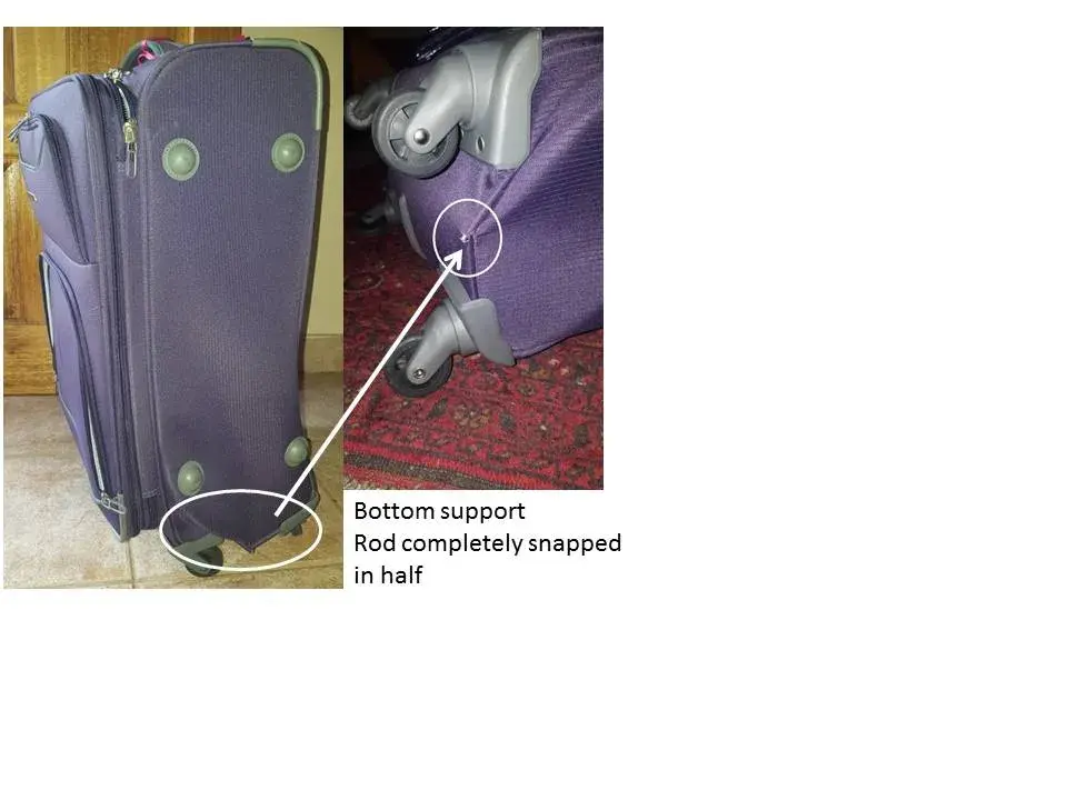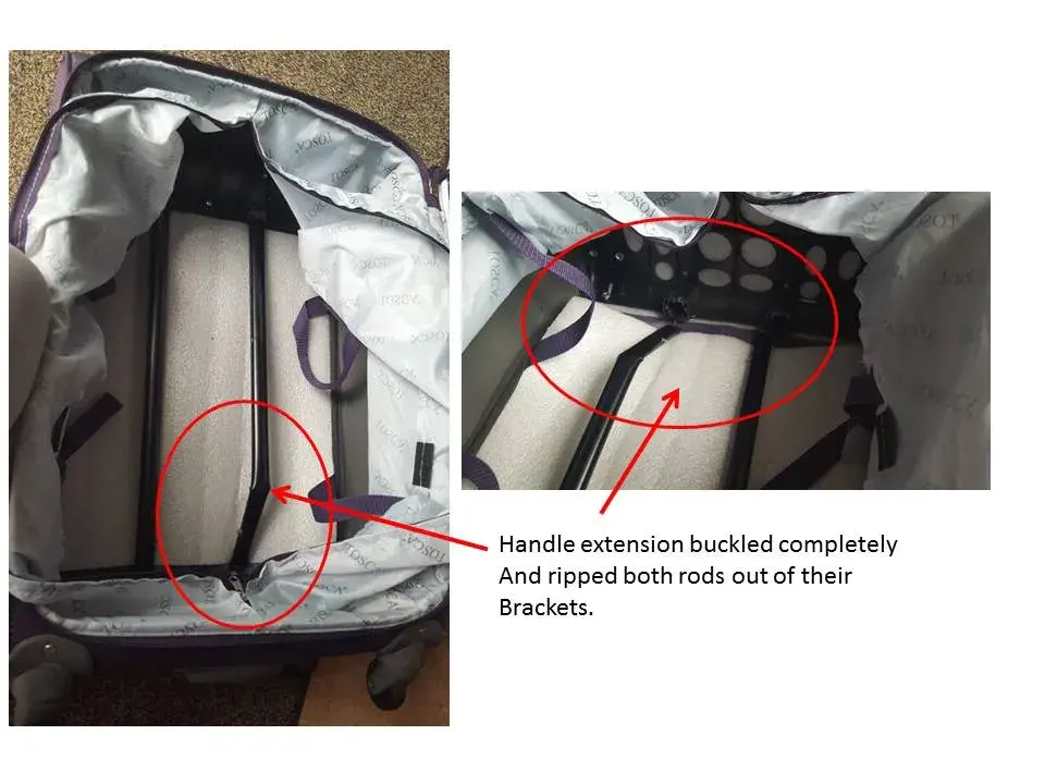 We could also not extend the handle from the top of the suitcase, and when opening the suitcase, we found that the extension had been buckled and both rods were ripped from their brackets.