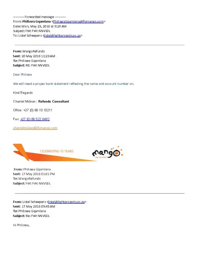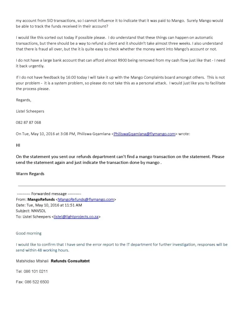 I normally travel between Cape Town and Lanseria airport, Johannesburg via Kulula.com. I had an emergency situation at my office in Jhb on Monday, 09 May 2016 and needed to book a flight the same day. I did book a seat on a flight at 17.00 flying from C.T. International to Lanseria. Flight No. JE716 at a cost of R1, 006.51. I now wish that I had not booked with Mango, but I was limited due to time constraints. However, in terms of cost though they were only a few Rands cheaper and I would have taken a later flight with Kulula if I had known how bad booking with Mango was going to be.