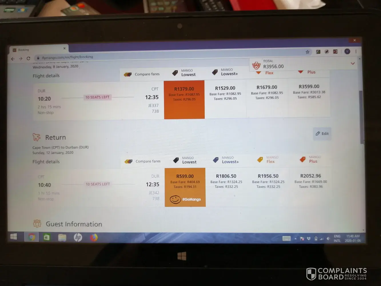 I was trying to book flights for 2 adults, leaving Durban on 8 Jan 10:20 flight R1379 and returning 12 Jan 10:40 gomango low fare R599 bringing the total to R3956, but when I make payment it says flight sold out.