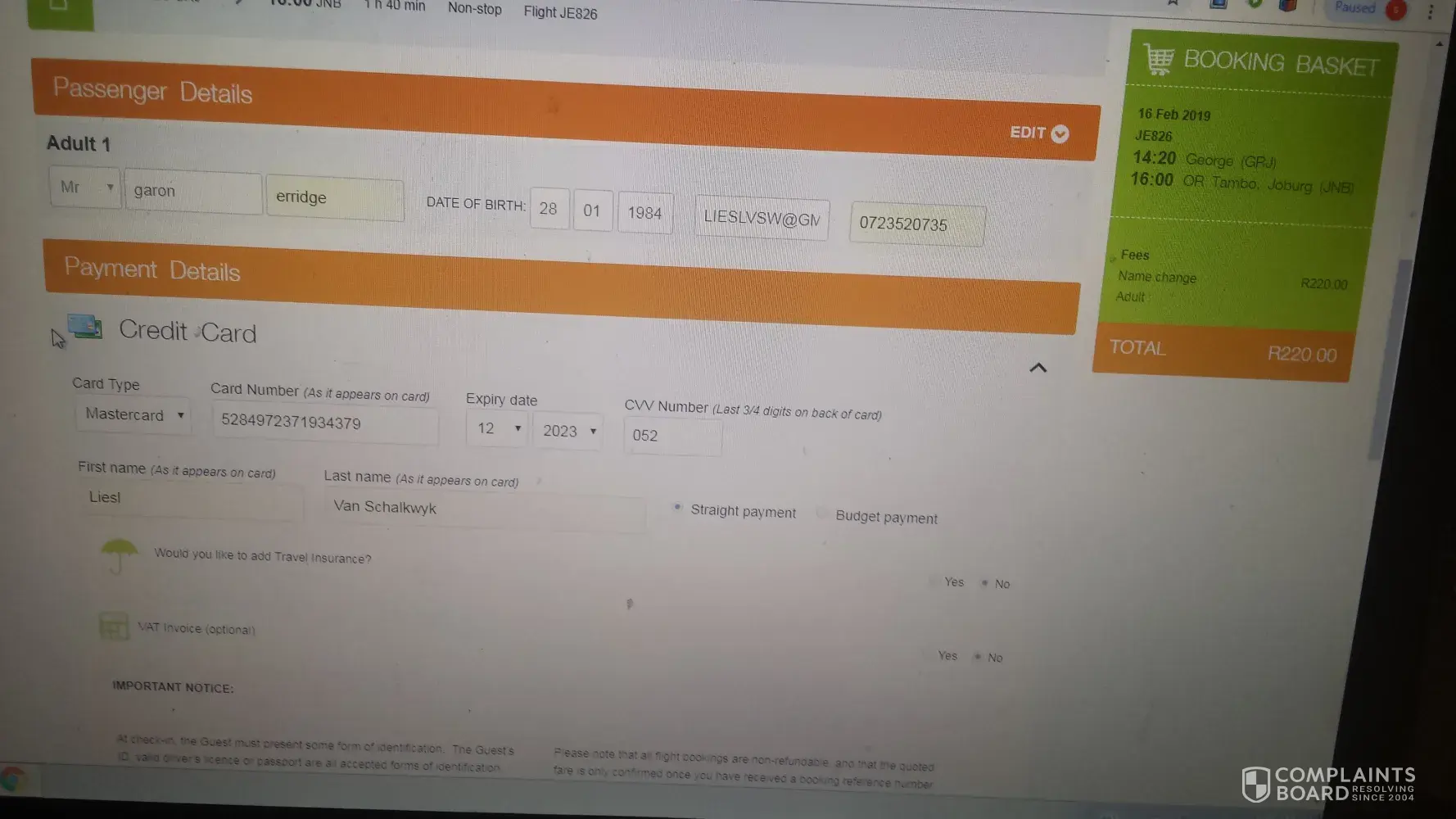 I am extremely upset I phoned earlier in the week and spoke to a lady by the name I think was tana I had my wife's name and I'd number booked which was wrong the lady told me what I must do she spoke to her supervisor and they said they can do it now for me change my wifes name and her id number to mine for a fee of 390 or I can go on the website and do it myself for a fee of 220 I done exactly what you guys told me to do you flipping took my money my name is right but my flipping I'd number went back to my wife's someone needs to phone me ASAP! to sort this out my number is [protected] or you can phone on my wife's number which is0763134166 this is flipping not right you need to contact me right now this is your systems error not mine I'm waiting I have proof I even took a photo just in case something like this should happen before I dine the payment my flight is on Saturday 14 20 from George to jhb my I'd is [protected]