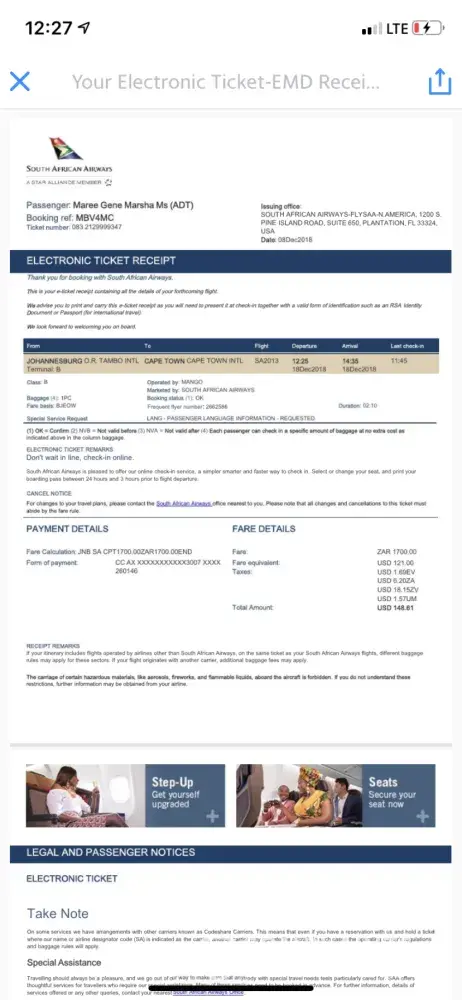 I did a long flight journey recently from USA to Paris, Zurich and over to Johannesburg. My flight journey was fine until I got down to South Africa. My flight leg ended in Johannesburg so I purchased a flight to Cape Town. I went on SAA website because I wanted to fly with SAA airlines because they have a bigger baggage allowance and I had 2 bags check in. Otherwise the extra Baggage fee is R300 with SAA. I purchased a flight online & the site gave me a Flight operated by Mango airlines! This has a much different baggage policy & instead of paying R300, I had to pay R1150 at the airport. I do not appreciate and am very unhappy that SAA website sold me a flight operated by Mango & would not uphold the same baggage policy as SAA. I feel I was tricked into buying a flight operated by another airline and then charging me much more for my extra baggage. I also was not able to buy the Mango online Baggage charge at R35 a Kilo and instead had to pay R50 a kilo because of the incompetent worker at SAA who Iputted my date of birth incorrectly the desk agent at Mango told me that I could not be found in the system at mango kiosk to purchase the lesser Mango baggage fee before flying. My birthdate is August 24, 1982. Then I took my hand luggage to fly Mango and there was no space for anything on board so we had to leave all our luggage at the gate and the baggage handlers threw my bags around so that the big wine glass that had flown around the world in perfect condition, was completely crushed when it arrived in Cape Town. As you can see there has been multiple issues on my short flight to Cape Town and this in unacceptable because my entire journey around the world was pleasant and the last 2 hour flight was a nightmare and I was exhausted from my long journey and then I have to deal with all this incompetence and frustrations. I would like a refund of me baggage fee and to claim for my damaged object. I should have been allowed to take a 2nd bag because I flew over from 3 international flights and the airline should look at my paperwork and allow this extra bag to be checked in without a crazy Baggage fee... thank you Gené Maree (Genae) [protected]@yahoo.com +[protected] [protected]