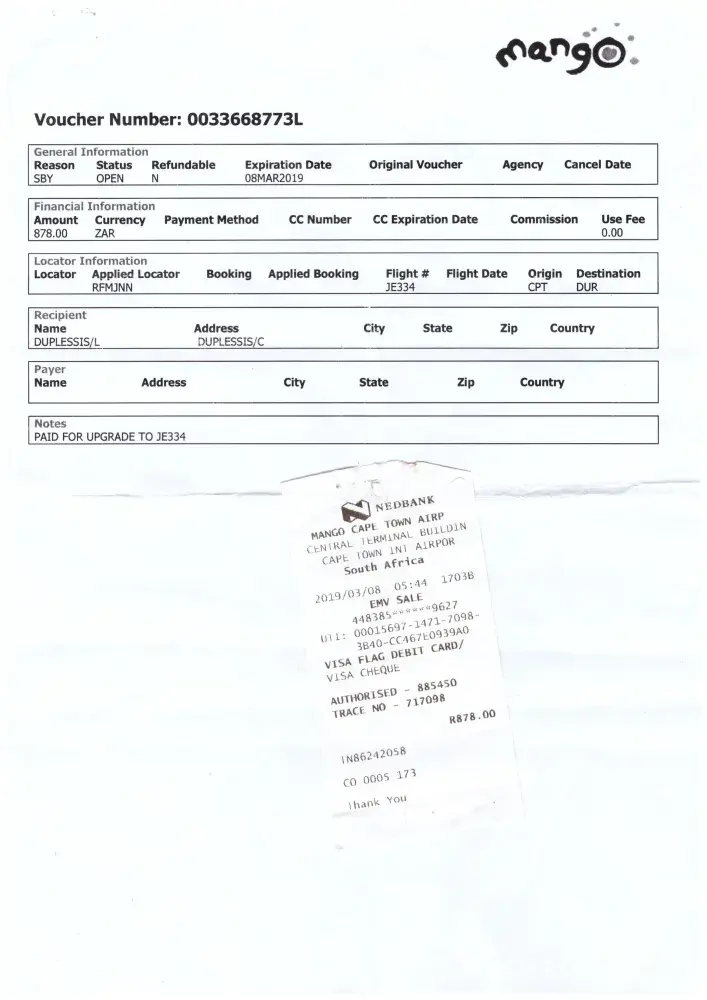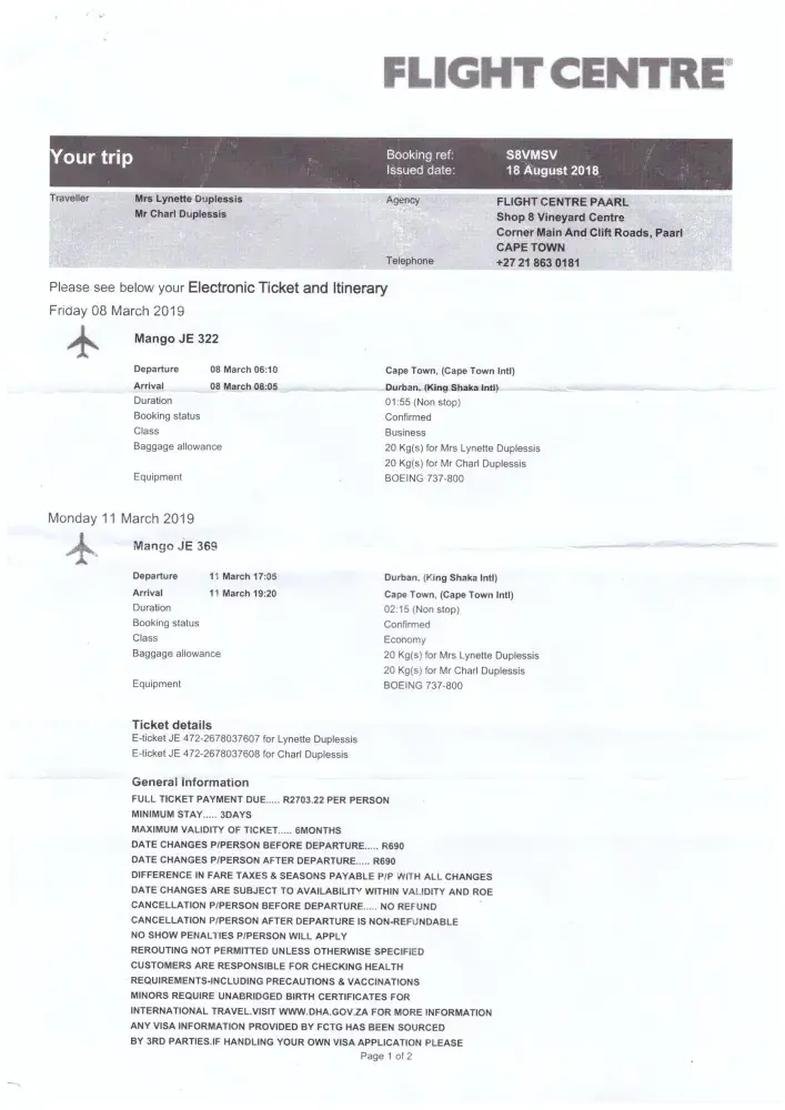 1. The Mango Airline's attendant at King Shaka International Airport struggled for almost 20 minutes to capture my passport and visa information. Two other Mango employees came to assist and eventually my bags were checked in. Unfortunately, my boarding at Johannesburg was delayed due to incorrectly capturing of information. This was confirmed by the flight attendant of SA 0264 and only the supervisor could override the system to allow my boarding. It resulted that everybody could board before me and I had to wait at the front desk. This has never happened with me with the same passport and multiple entry Schengen visa (November, 2018 I used Turkish Airlines and April, 2018 Qatar Airwaves for same business purpose).