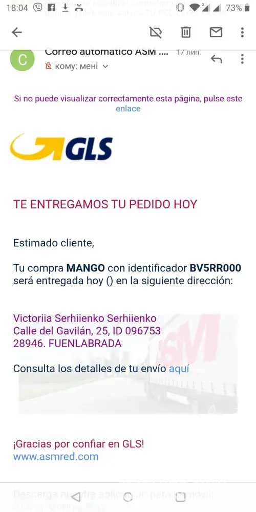 Hello! My name's Victoria and I've made a purchase on www.mango.es in July, 13, 2019. An e-mail letter of confirmation of it's delivery on 17/07/19 (BV5RR000) to my home address was received by me but still there is no parcel got. I NEED a PDF receipt with an electronic signature of the order which should have been delivered to me. My mail is [protected]@gmail.com.