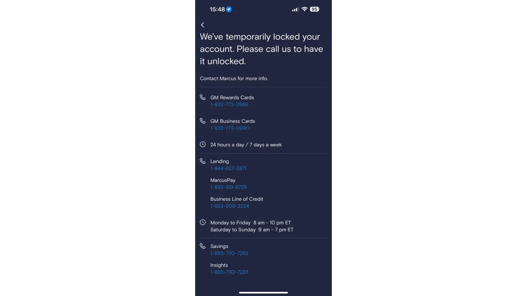 I made my first phone call to Marcus on 06/20/2023. They refused to tell me why my account is locked. On 06/21/2023, I called Marcus, they refused to tell me why my account is locked. They said they would send the affidavit of identity (the letter to verify my identity) will be sent out in 5 business days.