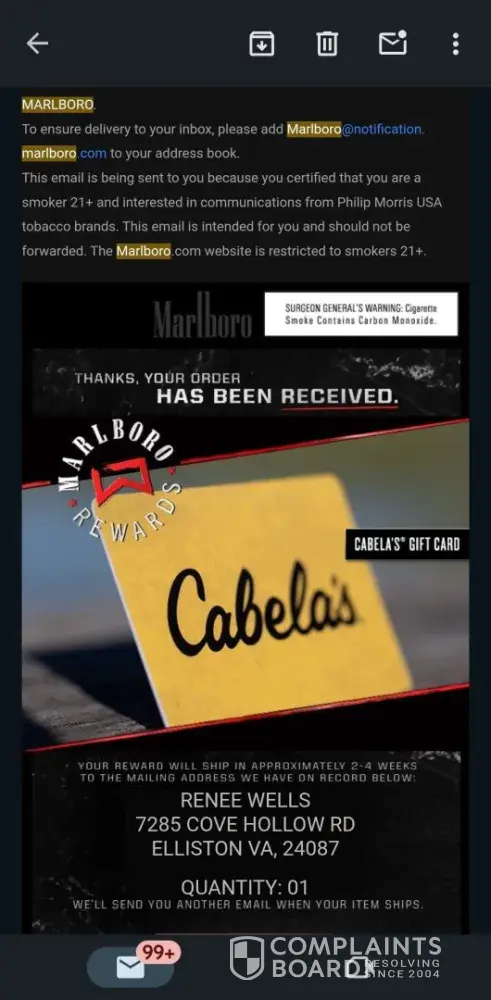 I was informed by Marlboro through email in June 2023 that I had won a $200 Visa gift card. I am still waiting for it and it is now January 2024. I have called multiple and multiple times and I have emailed even more multiple times. I was getting responses back in June July August and they were telling me different stories that I was going to be receiving it. And now the emails I am sending I am getting absolutely no response whatsoever.