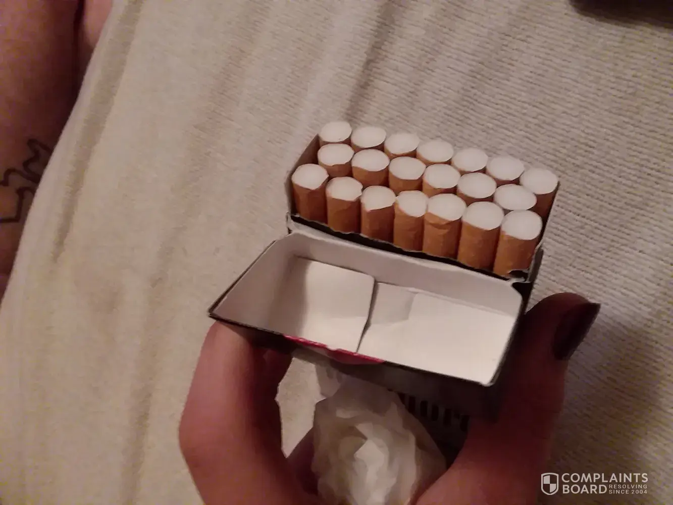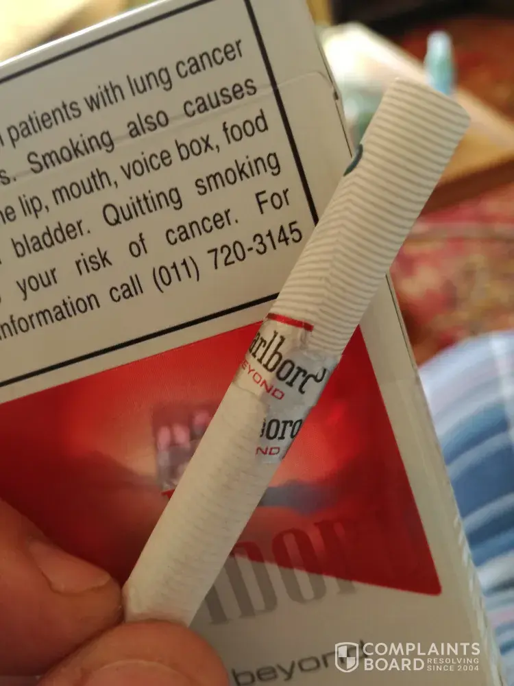 Just posted a complaint. And this is what i find in second packet i open today just after i posted. This is really unacceptable, the filterpaper is not even covering the filter not even to talk about the tobacco. A packet of Marlboro beyond red price is 38rand so out of an carton i throw away a whole packet if there is 2 sigarets that is faulty. You must please give attention to this asap seeing that your company is going to loose alot of loyal consumers.