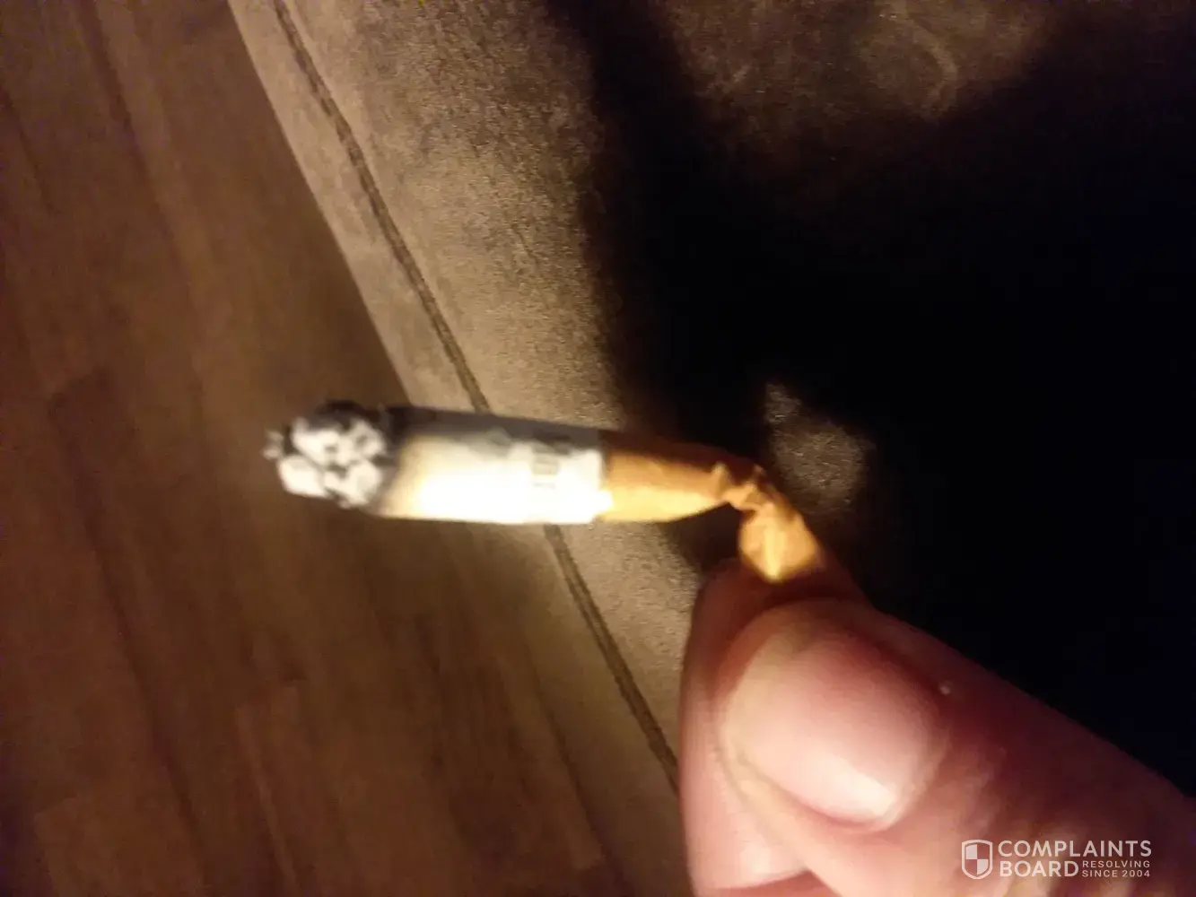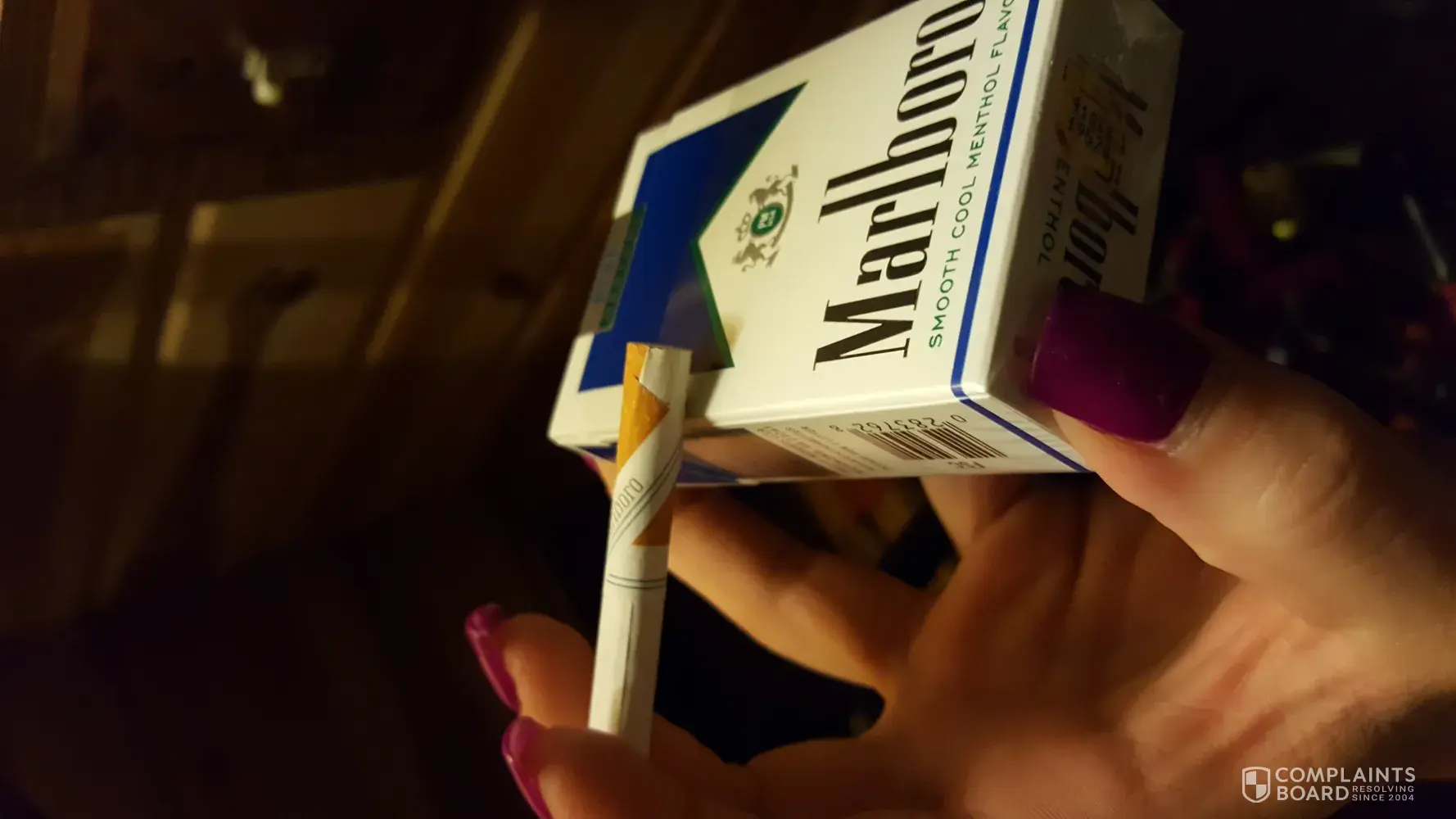 I wish to complain about the tobacco in my recent packet of Marlboro: 2-3 cm long pieces that I would describe as stem.