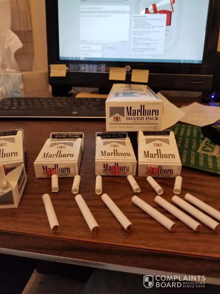 I've never done this before so I wish I didn't have to do this but I brought 2 packs of Marlboro 100 black reds and there were 3-5 cigarettes that were broken in each packs. The box was not crushed and everything looked good. I purchased them from Sadlers in Dunn NC 28334. It just seems so odd. I've been very pleased with your company and I will continue to buy. Thank you for your time and I look forward to staying with you.