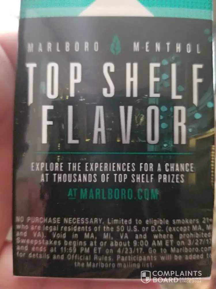 Tried finding territory rep in my area but didn't find any information, decided to take this route. I purchased a Pack of Marlboro menthol 100 on 9/5/17 from a local gas station in owensboro ky. After opening the pack I notice a offer to win Top shelf prize. The expiration date was 4/23/17. Today is 9/5/17. My question is why these packs still being sold if the prize offer is expired shouldn't that mean the packs that have this entry offer be removed.