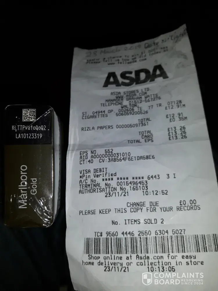 I bought a packet of cigerettes from Asda Walton Liverpool and opened them up and smoked one and found it to be stale.
