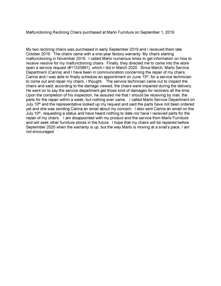 My two chairs was purchased in 9/19 and I received them 10/19. They came with a 1 year warranty. By 11/19, my chairs didn't work. I've been trying to get resolve since and finally, I was directed to go Marlo for a service request, which I did. Finally, a service tech came out on 6/13/20, determined it was delivery damage. Nothing since!