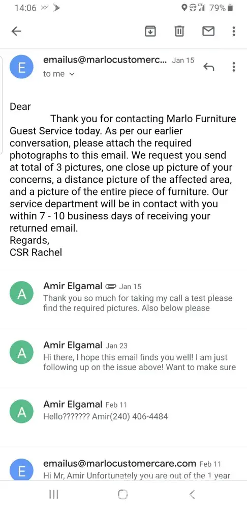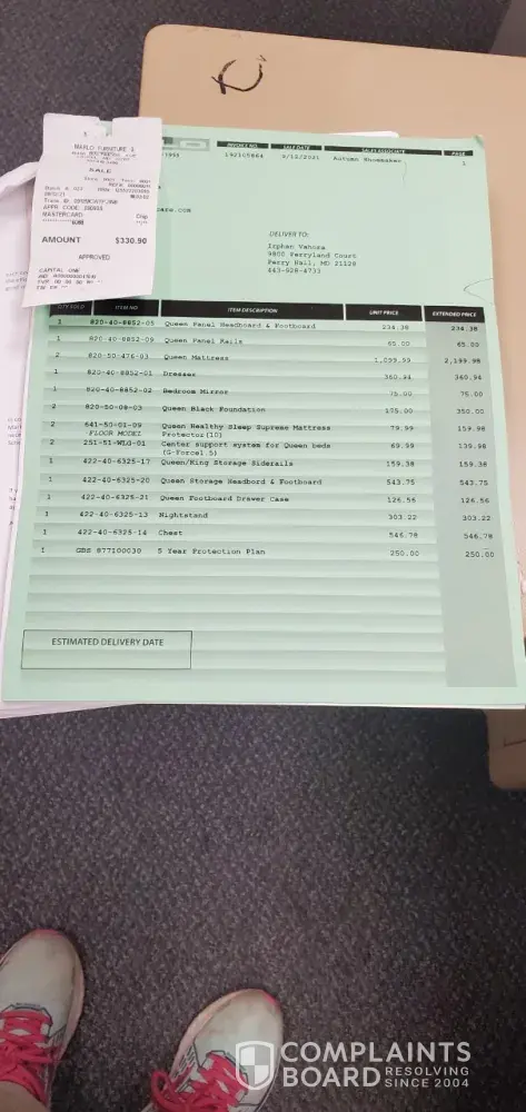 Hello, my name is Amir Elgamal and my phone number associated with my Marlo's purchase order is [protected] In about July, 2019 I went to Marlo furniture in Rockville and purchased a bunch of furniture for over $7, 000, including a pool table. First of all, it took them about 2 month to deliver the items when I was told 4 weeks. Second, the furniture...