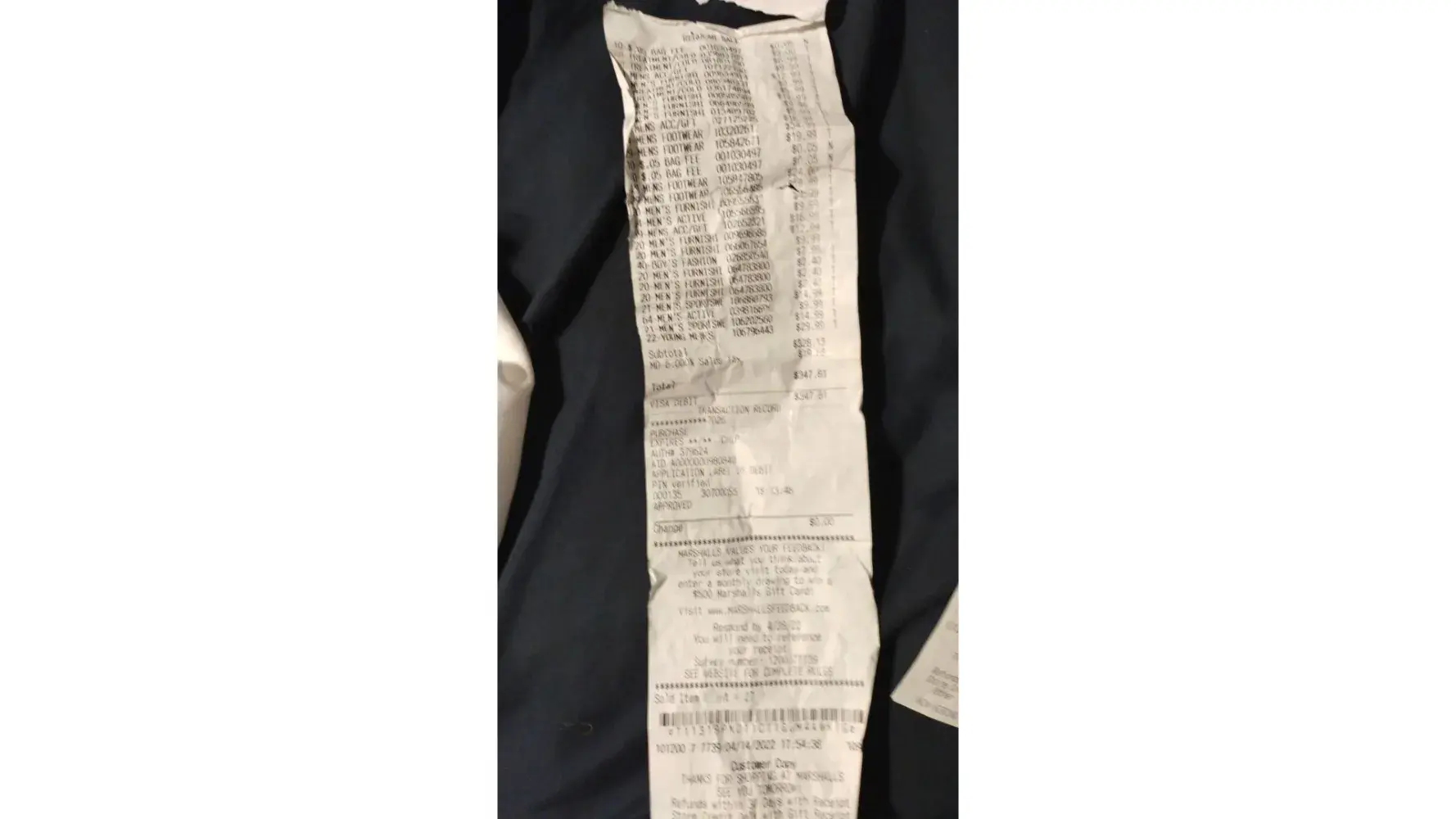 Desired outcome: Refund my money for the broken item. Depicted in the picture is one of two receipts. The other total was $324.00.